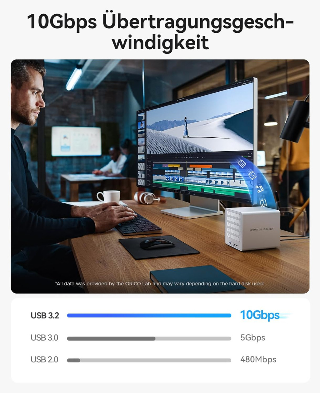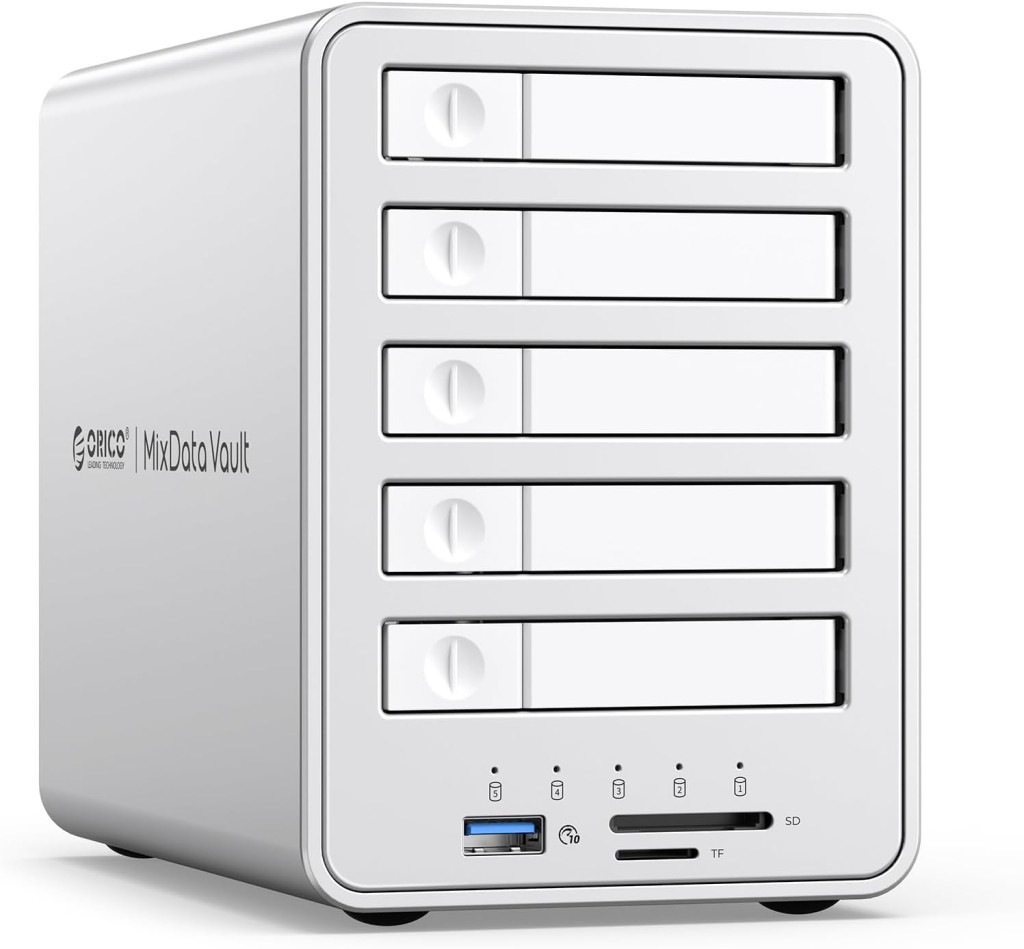Az ORICO All-Flash 5 Bay RAID Hard Drive Enclosure a professzionális felhasználók számára tervezett megoldás, amely ötvözi a teljesítményt, a megbízhatóságot és a hordozhatóságot. Az ultragyors USB 3.2 Gen 2 interfész biztosítja, hogy az adatok gyorsan és hatékonyan mozognak, míg a 7 RAID mód rugalmas konfigurációs lehetőségeket nyújt.