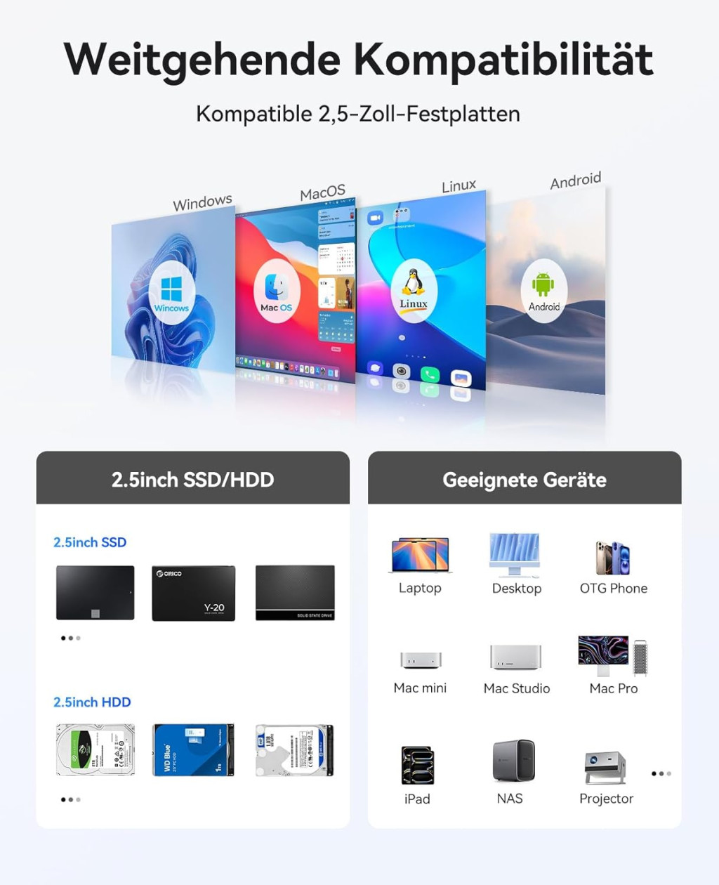 Az ORICO All-Flash enclosure teljes mértékben kompatibilis a 2.5 inch-es SATA SSD-kkel és HDD-kkel. Támogatja a 7 mm és 9,5 mm vastagságú meghajtókat, így szinte minden modern 2.5 inch-es tárolóeszköz használható. Az enclosure egyetlen meghajtóban akár 8 TB kapacitást támogat.