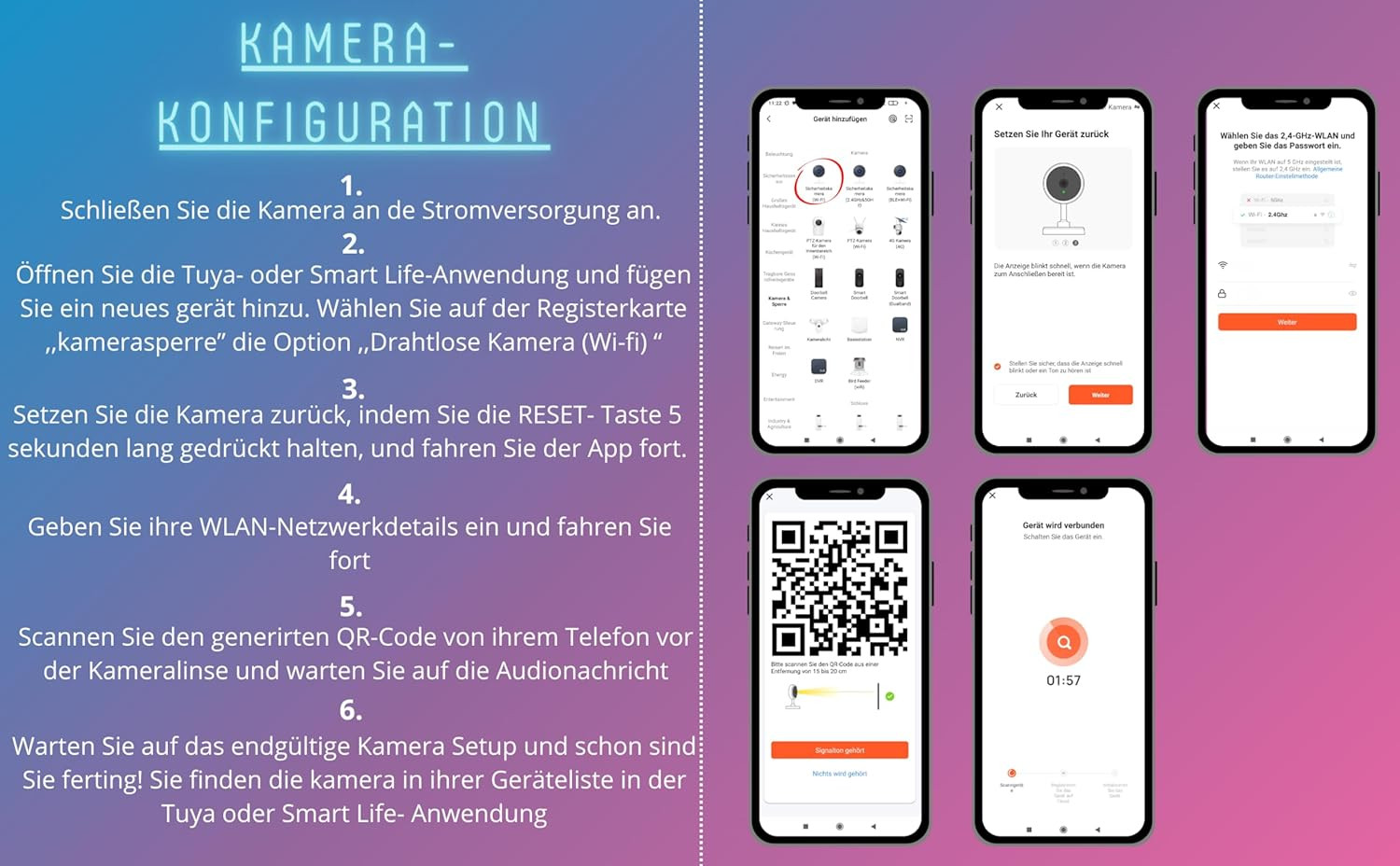 A kamera telepítése rendkívül egyszerű, a csomagban található rögzítőelemekkel könnyedén felszerelhető falra vagy mennyezetre. A TUYA vagy Smart Life alkalmazás lépésről lépésre végigvezeti a beállítási folyamaton, így perceken belül működésbe helyezheti a kamerát.