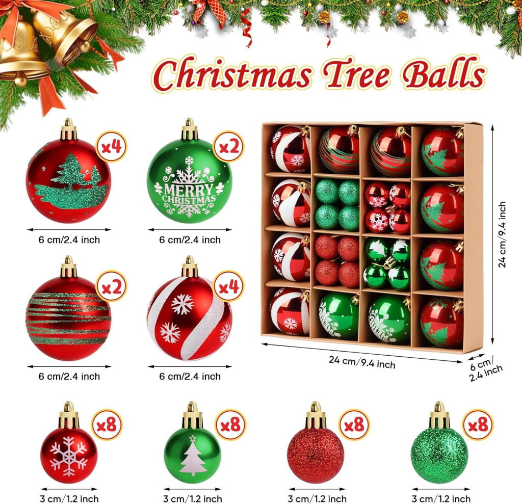 • Sokoldalú méretezés: 12 darab 6 cm-es és 32 darab 3 cm-es gömb, amely rugalmas díszítési lehetőségeket biztosít