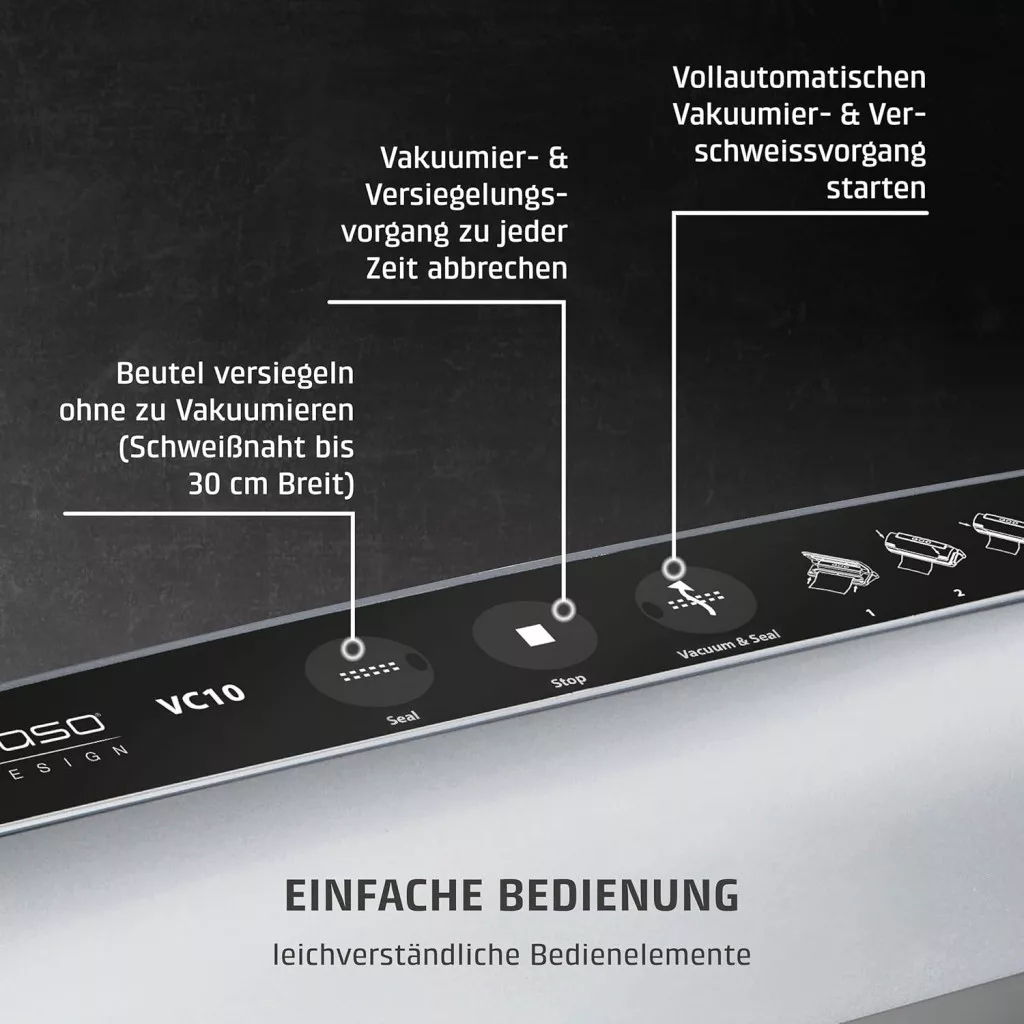 Az automatikus működés rendkívül felhasználóbarát, így még a kezdők is könnyen kezelhetik. A mellékelten 10 professzionális fóliazacskó azonnal használatra kész, és a vákuum tömlő lehetővé teszi a tartályok vákuumozását is. Ideális a nagy főzéshez, az élelmiszerek portionálásához és a Sous Vide főzéshez.