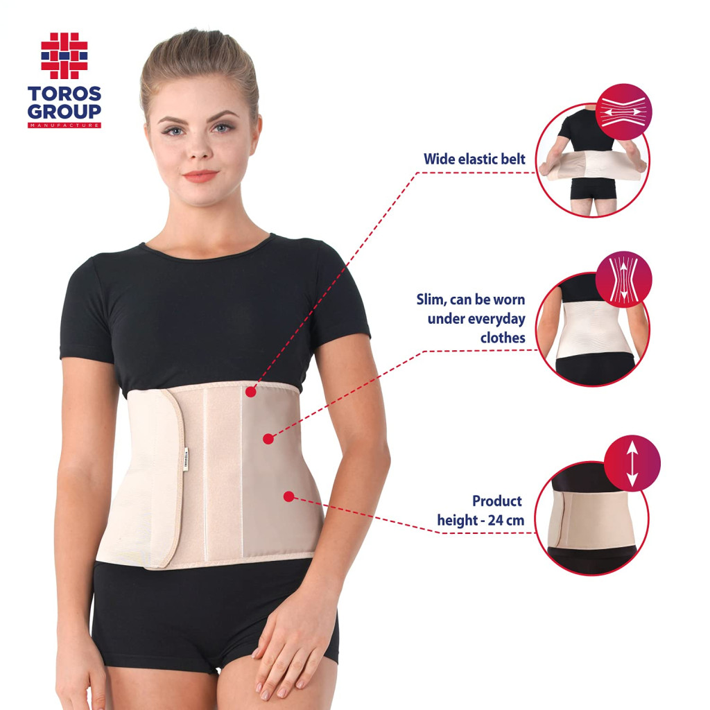 Centura abdominală post-nătare și post-operatorie TOROS-GROUP este un dispozitiv de suport abdominal elastic de calitate profesională, care, cu banda sa lată de 24 cm, asigură o presiune fermă și uniformă în zona abdomenului, a taliei și a spatelui inferior. Acest produs facilitează în mod special regenerarea rapidă după naștere, cezariană, hernie abdominală și alte intervenții chirurgicale abdominale.
