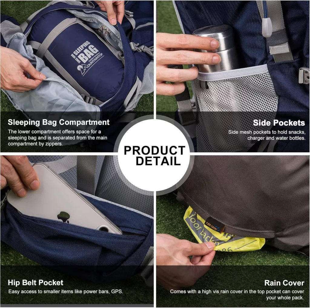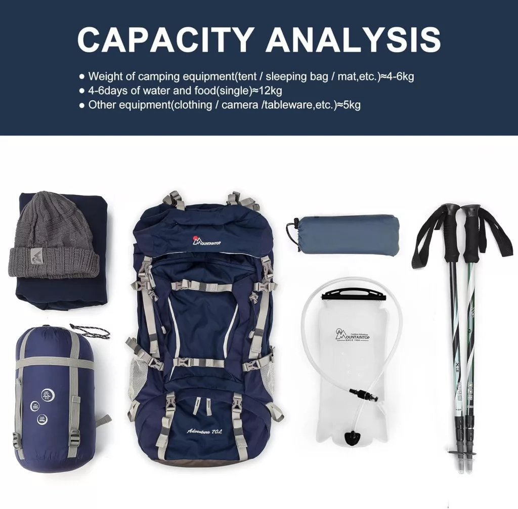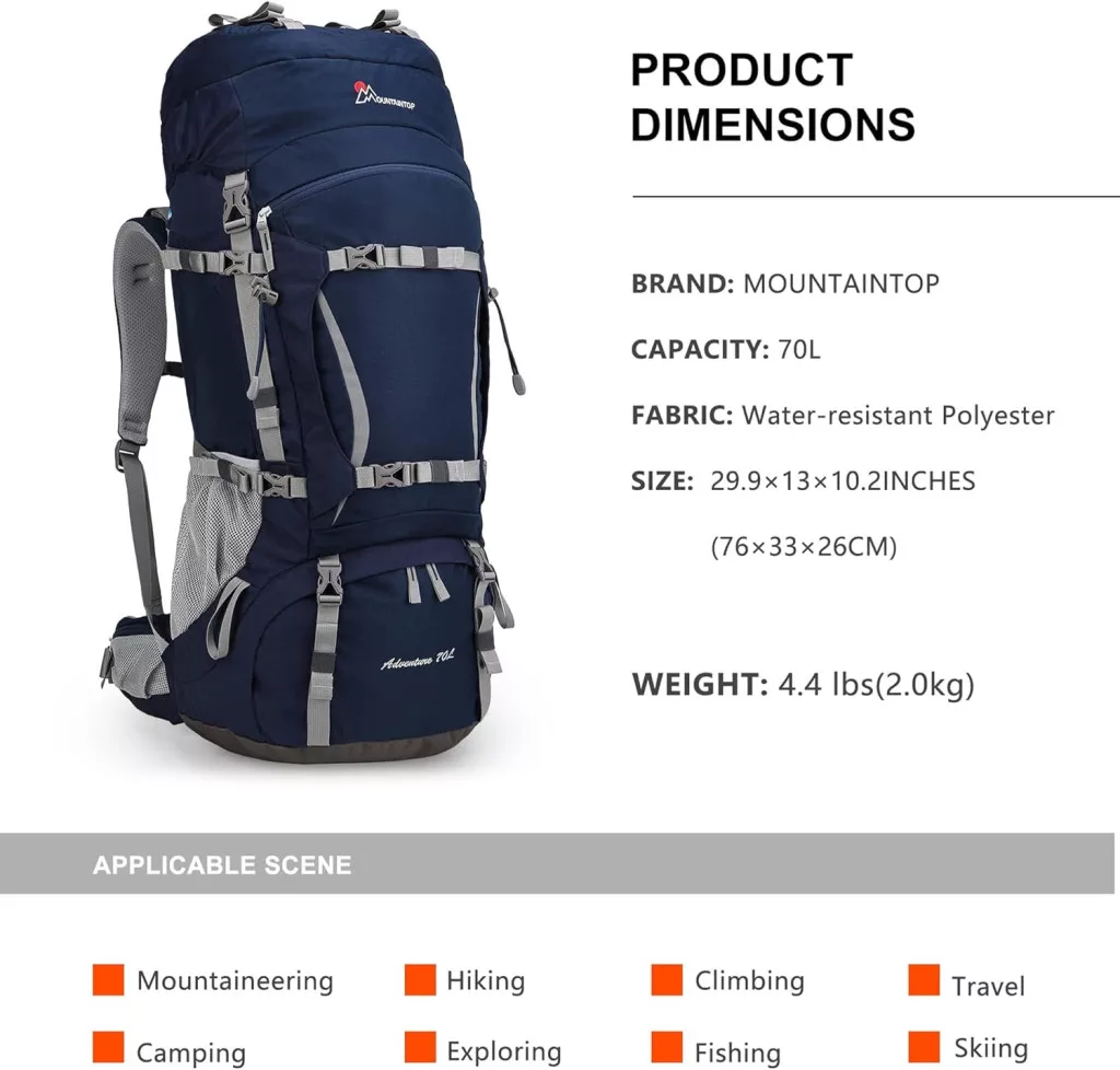 Rucsac de trekking MOUNTAINTOP 70L cu husă de ploaie, pentru bărbați și femei, ideal pentru drumeții și camping