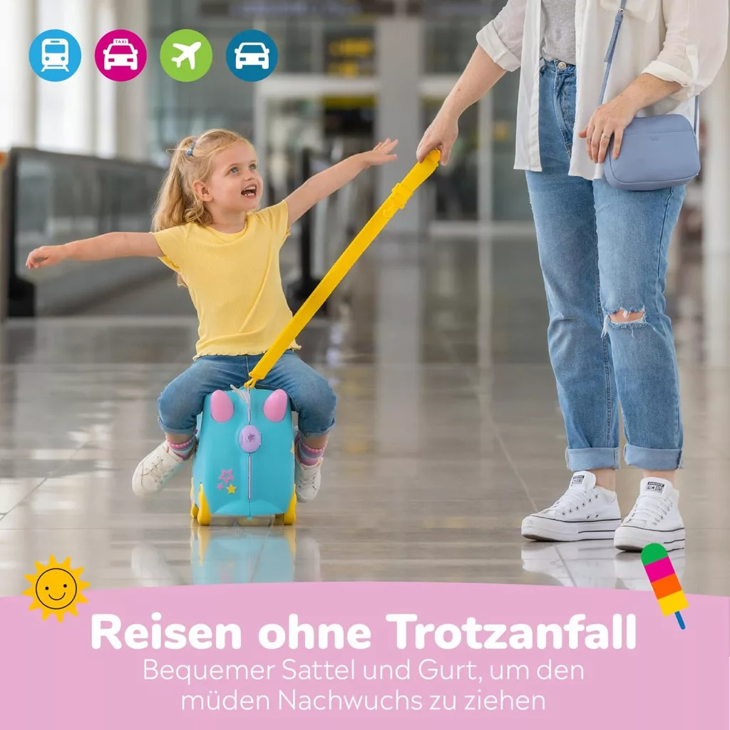 • Valiză dură, pe care copilul poate sta și cu care se poate plimba