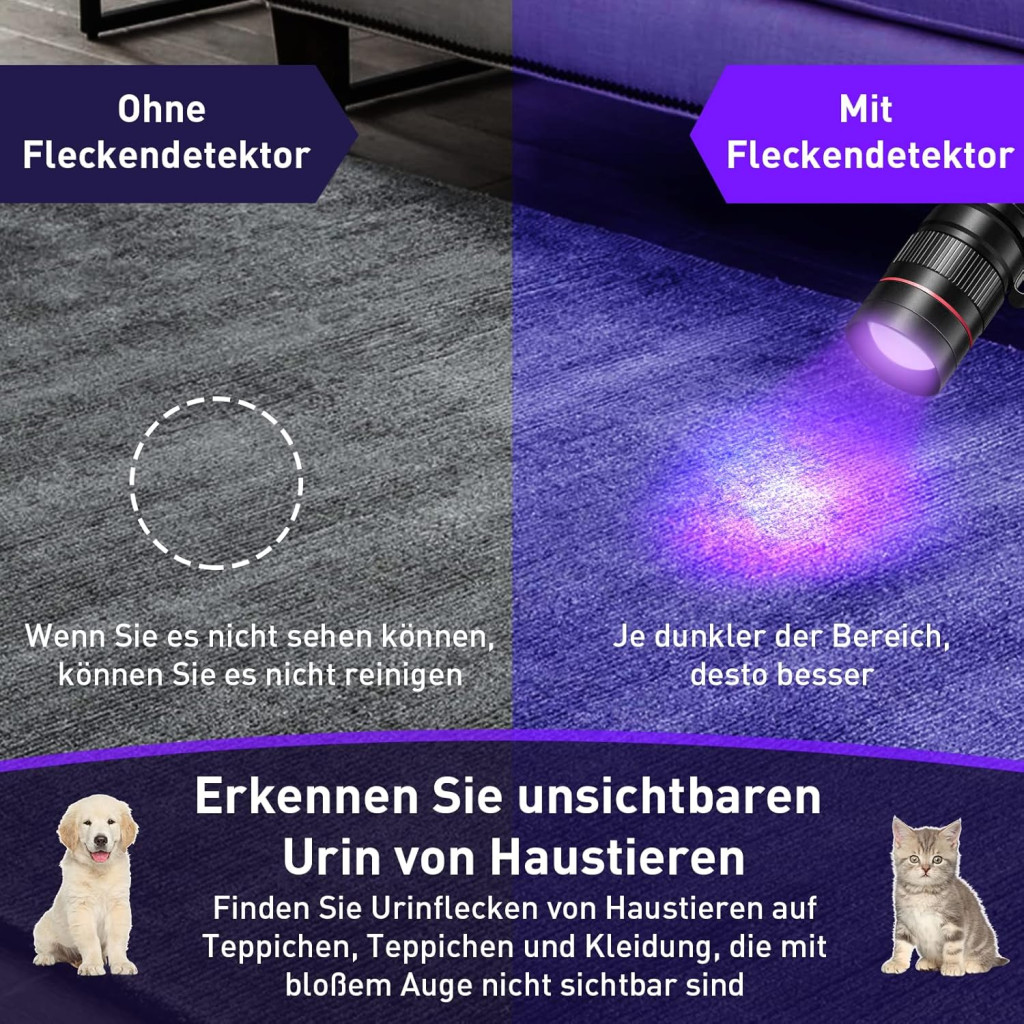 Urmele de urină de câine și pisică strălucesc sub lumină UV. Puteți identifica ușor petele ascunse de pe covoare, draperii și mobilier, care altfel ar fi greu de găsit.