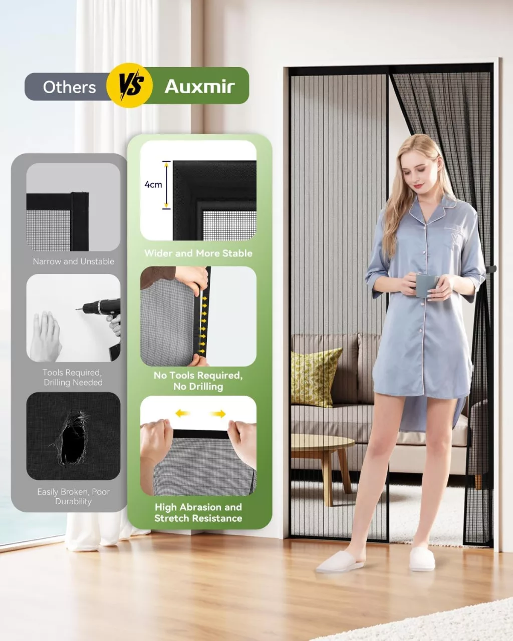 Plasa magnetică anti-țânțari Auxmir este una dintre cele mai bune soluții de pe piață pentru protecția împotriva insectelor. Produsul este fabricat din materiale de înaltă calitate, care garantează o durată lungă de viață. Sistemul de închidere magnetică este complet automat, astfel încât nu trebuie să vă faceți griji cu privire la închidere. Plasa de poliester respirabilă asigură că aerul proaspăt poate circula liber, în timp ce insectele rămân afară.