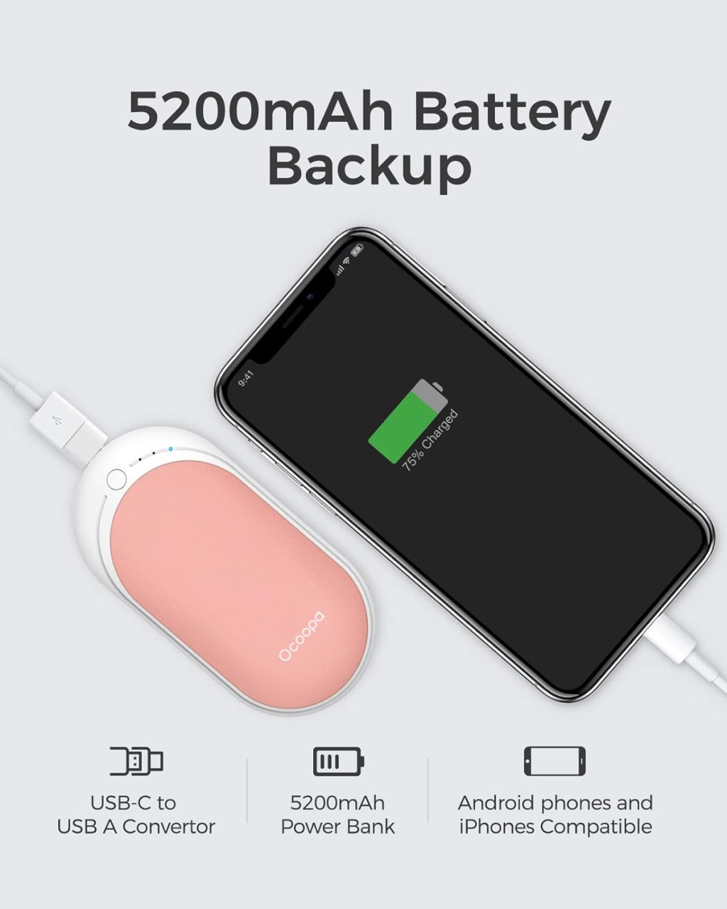 Încălzitorul de mâini reîncărcabil OCOOPA este combinația perfectă dintre tehnologia modernă și confortul clasic. Acest dispozitiv versatil nu este doar un încălzitor de mâini, ci și un power bank portabil, care vă asigură că mâinile dumneavoastră rămân mereu calde, în timp ce vă puteți încărca și dispozitivele electronice. Bateria litiu-ion de 5200 mAh garantează o durată lungă de funcționare și performanțe fiabile.