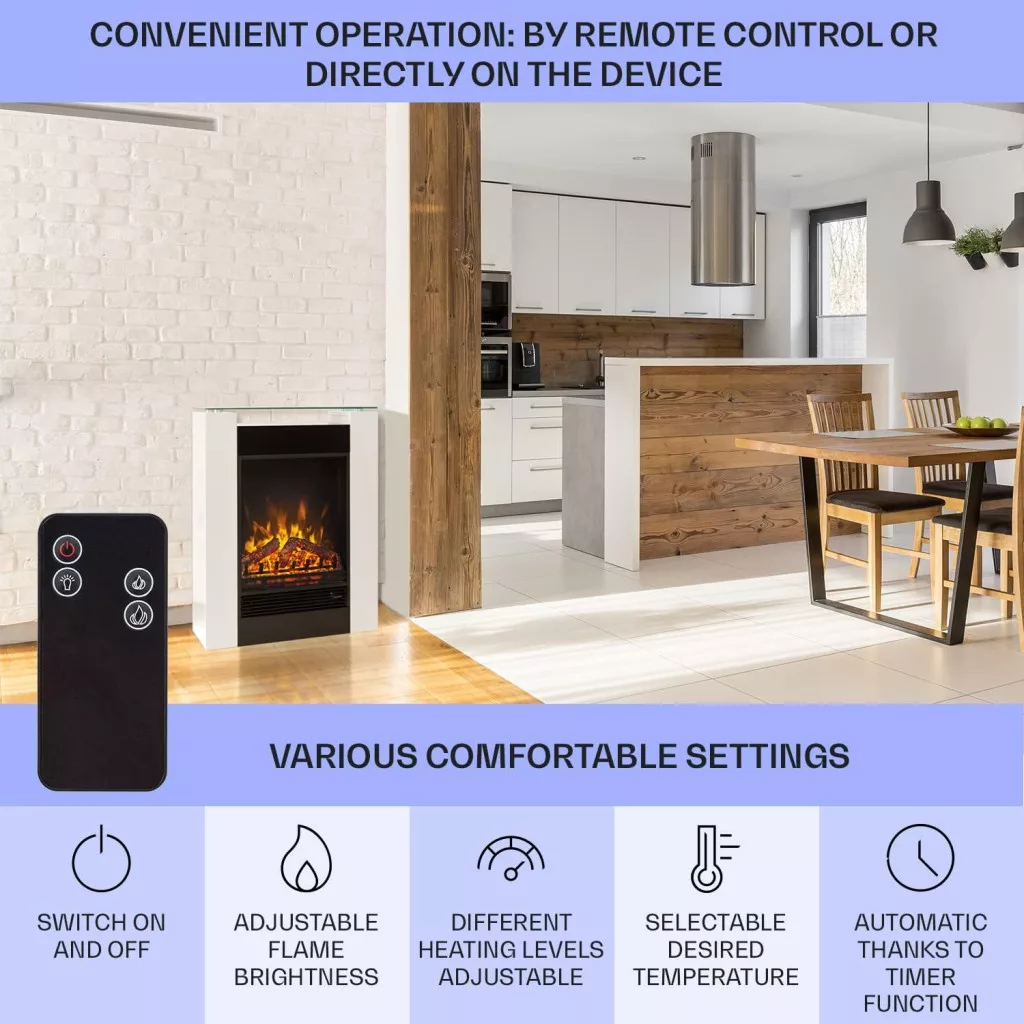 Cu funcția de temporizator săptămânal, puteți automatiza funcționarea șemineului, astfel încât, de exemplu, să se aprindă automat dimineața sau să se stingă seara. Acest lucru nu este doar convenabil, ci și economisește energie. Telecomanda vă permite să controlați dispozitivul de pe canapea sau din pat, fără a fi nevoie să vă ridicați.