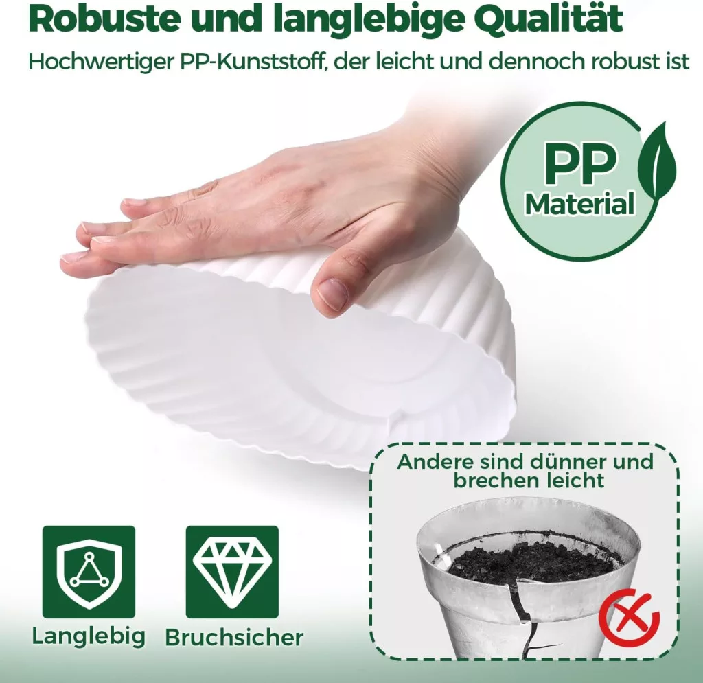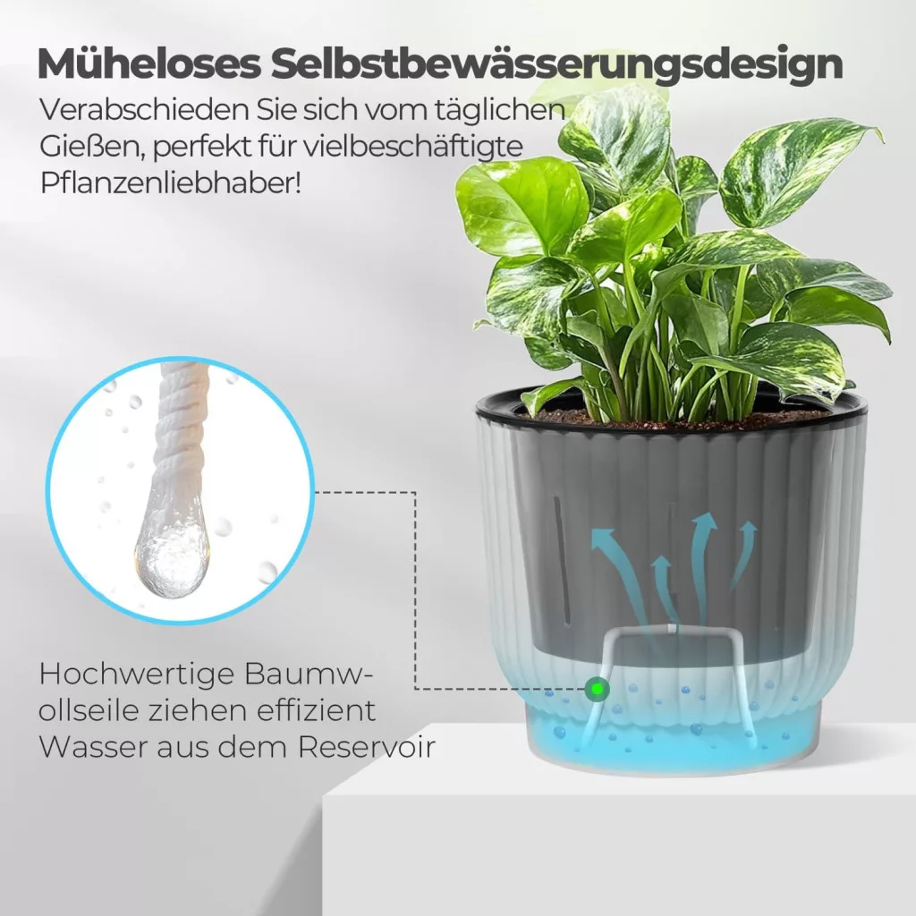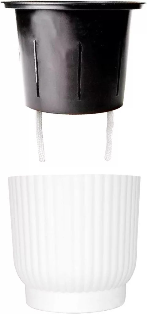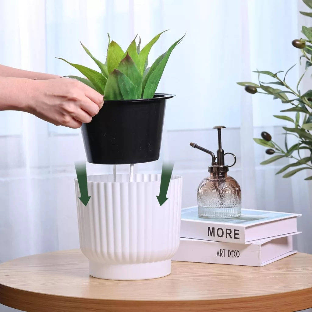 • Structură cu strat dublu: Apa este stocată între ghiveciul exterior alb și inserția interioară neagră, care este absorbită treptat