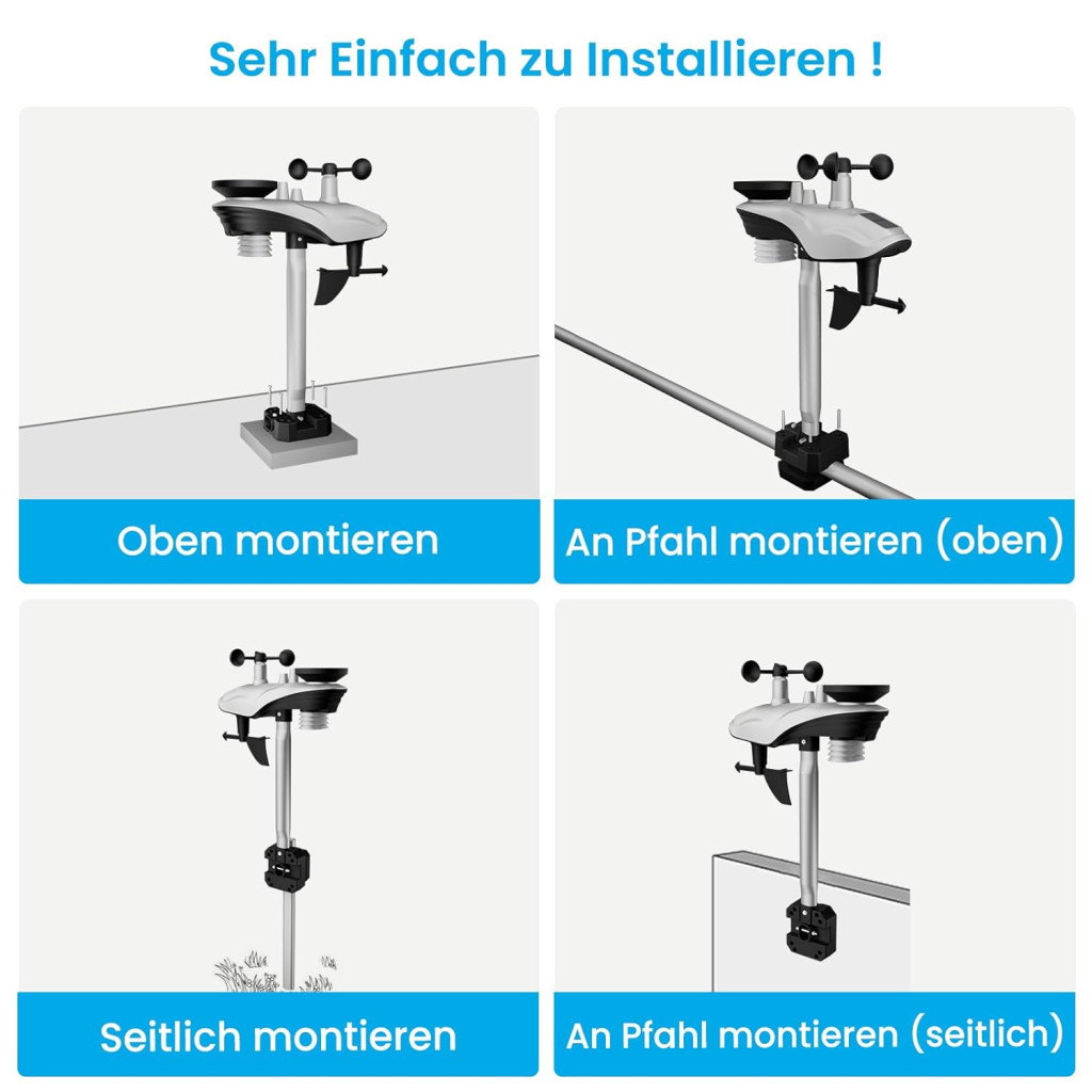 Instalare simplă: Instalarea dispozitivului constă în doar 3 pași. Senzorul extern poate fi montat cu ușurință cu suportul pe acoperiș, perete sau barcă, apoi se efectuează sincronizarea wireless cu afișajul. Conexiunea WiFi se face prin aplicație, nu sunt necesare cunoștințe tehnice.