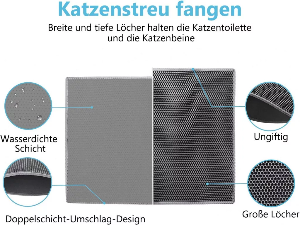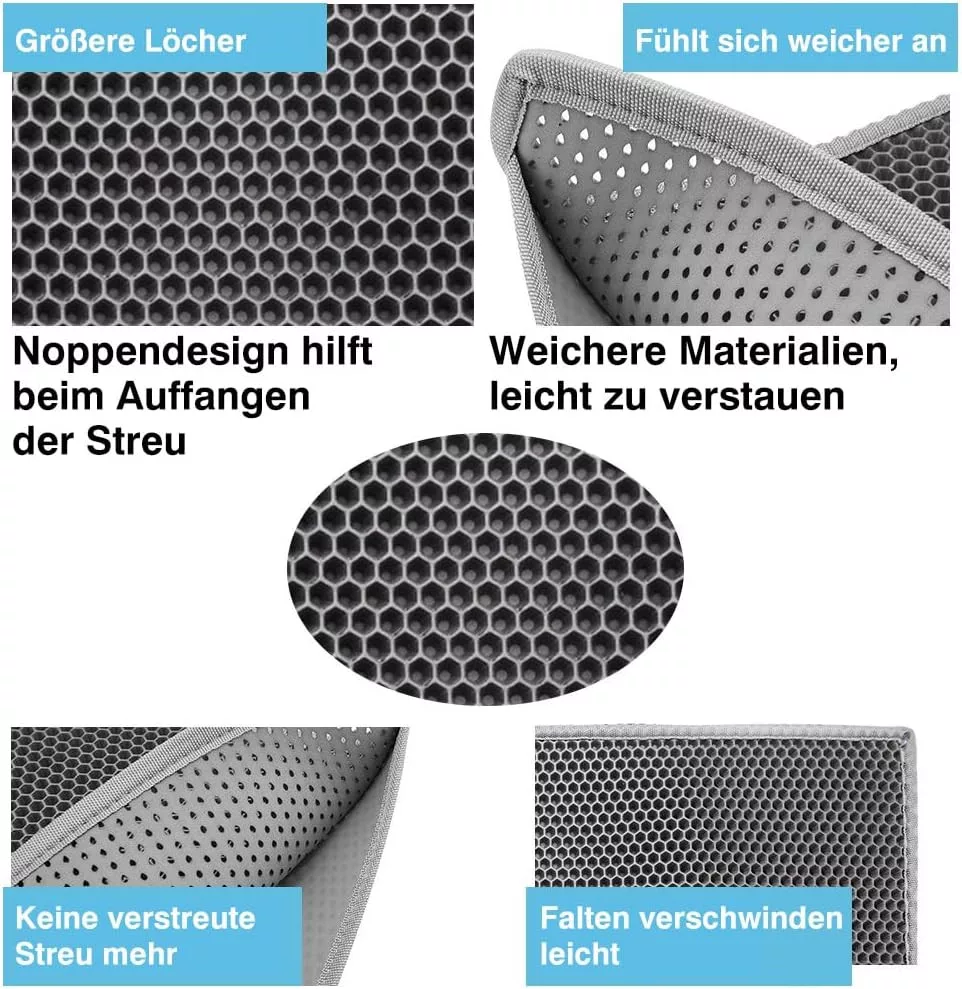 Covorașul este realizat cu o structură impermeabilă cu două straturi, care protejează podeaua împotriva nisipului împrăștiat și a urinei felinei. Materialul EVA moale, non-toxic, este delicat cu lăbuțele sensibile ale pisicilor, fiind acceptat cu ușurință chiar și de cele mai pretențioase animale de companie.