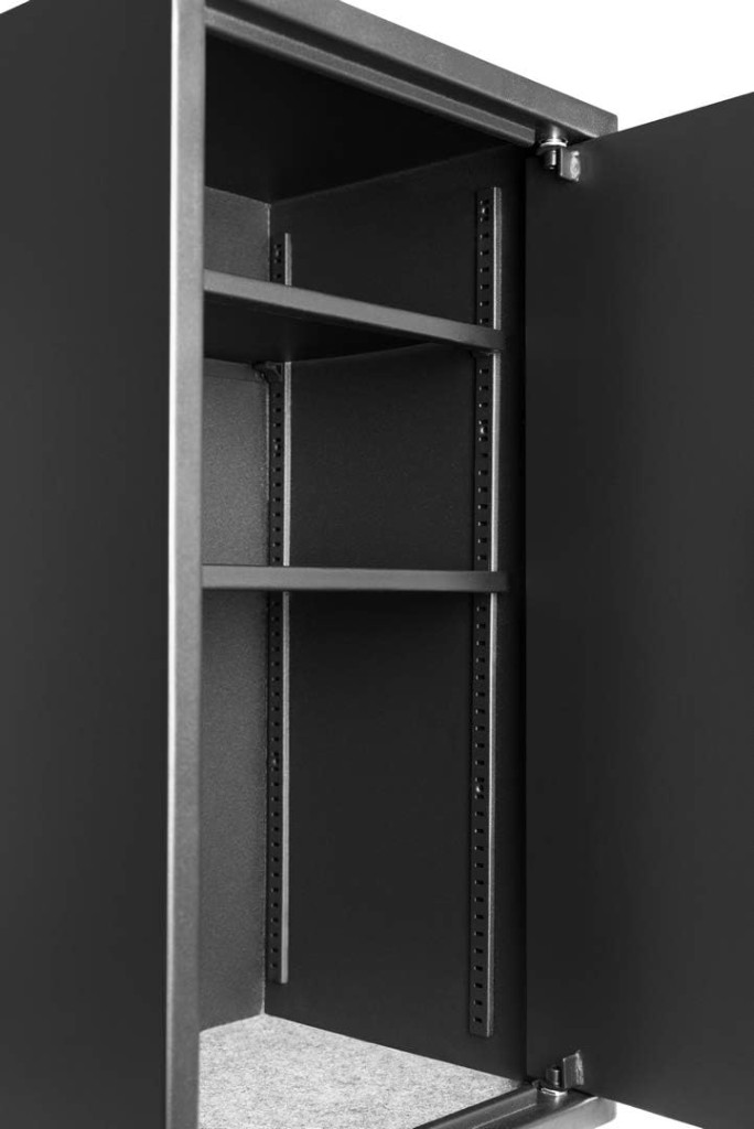 - Rafturi Interioare Reglabile: Cele două rafturi reglabile permit personalizarea optimă a interiorului seifului. Căptușeala interioară moale protejează obiectele de valoare de zgârieturi și deteriorări.