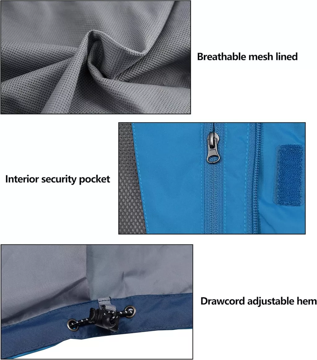 • Glugă detașabilă: Gluga cu șnur reglabil oferă protecție suplimentară împotriva ploii