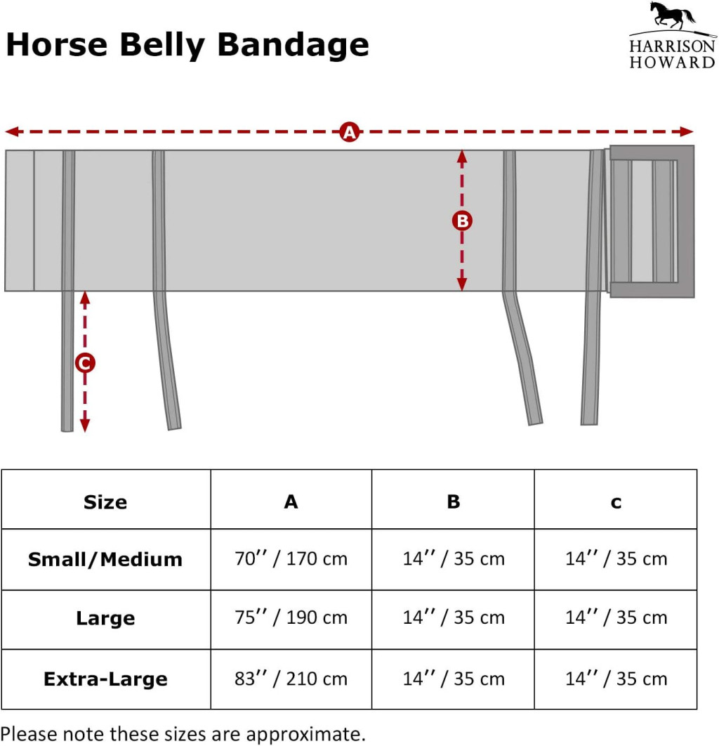 Apărătoarea anti-ciocăniri Harrison Howard este disponibilă în mărimea XL, care este ideală pentru caii mai mari. Cu toate acestea, datorită materialului elastic și a curelelor reglabile cu velcro, se adaptează excelent la diferite dimensiuni corporale. Cureaua abdominală este compatibilă cu majoritatea șeilor și a tipurilor de curele de șa și poate fi atașată cu ușurință sub cureaua de șa.