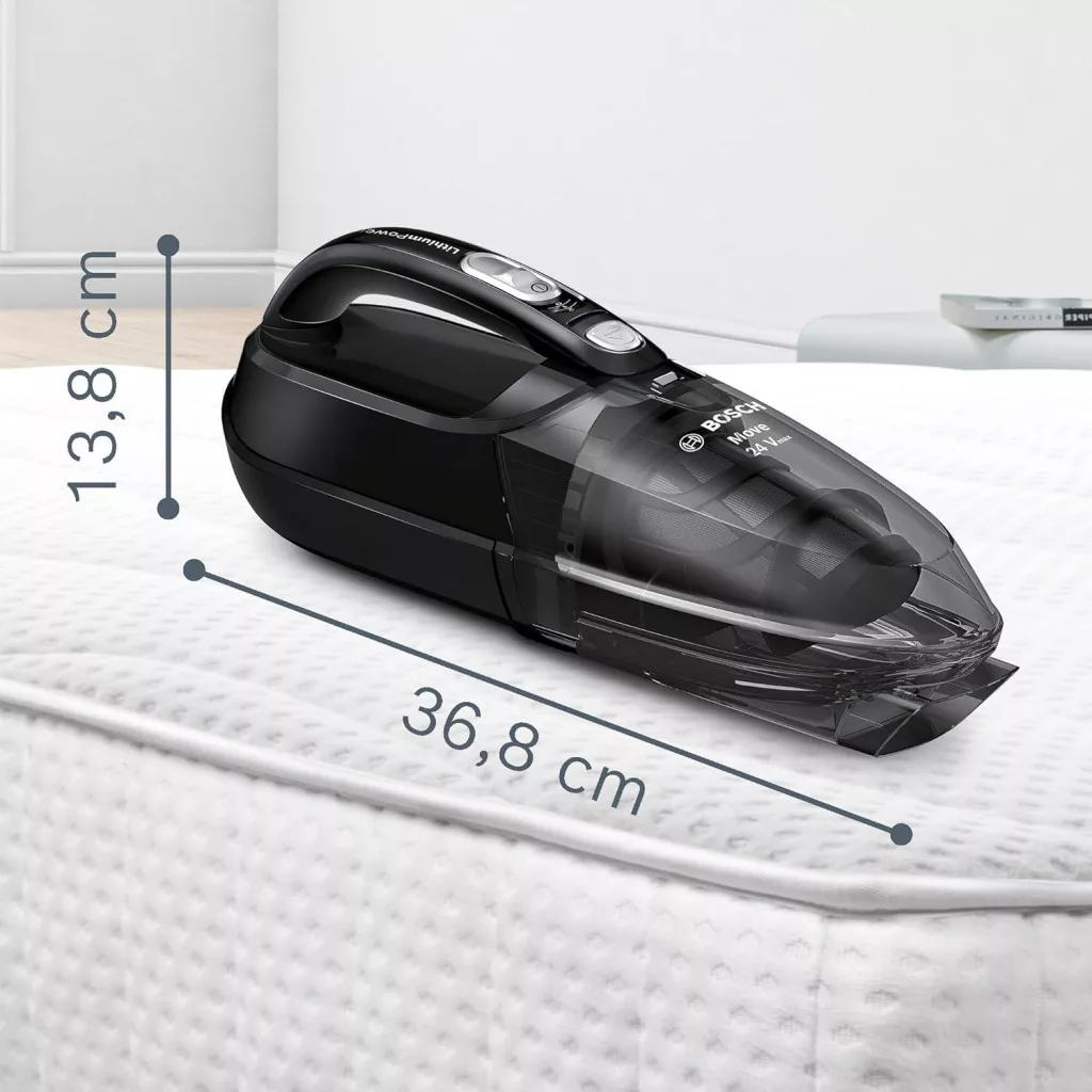 A Bosch Move BHN24L egy modern, vezeték nélküli kézitörlő porszívó, amely tökéletes megoldás a gyors és hatékony takarításhoz otthonában és autójában. Ez a kompakt eszköz egyesíti a nagy teljesítményt a könnyű kezelhetőséggel, így ideális választás azok számára, akik értékelik a kényelmet és a hatékonyságot. A 24V-os lítium-ion akkumulátor hosszú üzemidőt biztosít, míg a hármas ciklonszűrési rendszer garantálja a kiváló porgyűjtést.