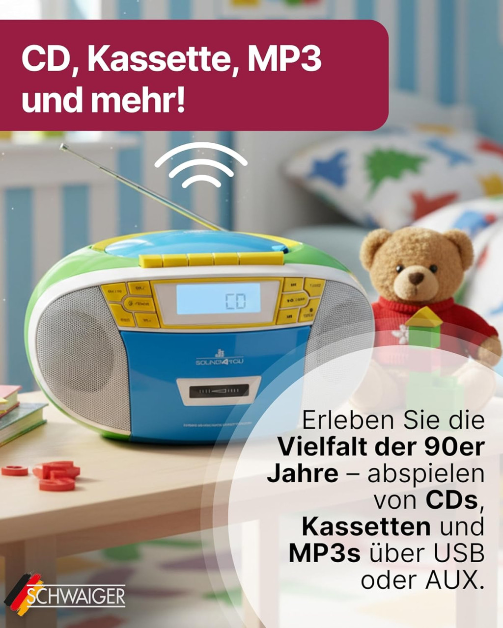 Radio-ul CD și casetofon retro SCHWAIGER 661644/661651/661668 este alegerea perfectă pentru cei care iubesc nostalgia, dar nu vor să renunțe la confortul modern. Cu designul său viu, distractiv, atât copiii, cât și adulții îl vor adora. Cu suportul său versatil pentru formate, designul portabil și calitatea fiabilă SCHWAIGER, acest dispozitiv este garantat să vă servească mulți ani de acum încolo.