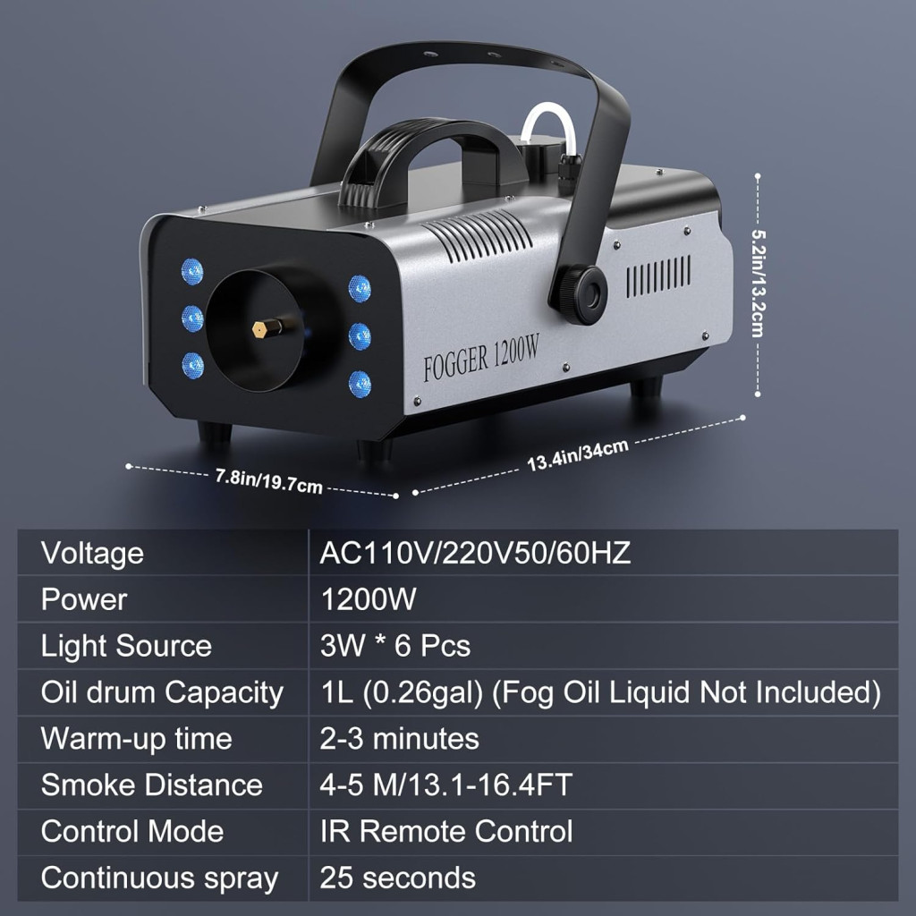 Această mașină de fum profesională UKing 1200W RGB revoluționează atmosfera evenimentelor tale! Combinația dintre puterea eficientă de 1200 de wați și cele 6 culori RGB LED controlabile oferă o experiență vizuală unică. Dispozitivul nu numai că produce fum dens, ci îl și iluminează cu lumini colorate, făcând astfel razele de lumină vizibile și creând o atmosferă uimitoare.