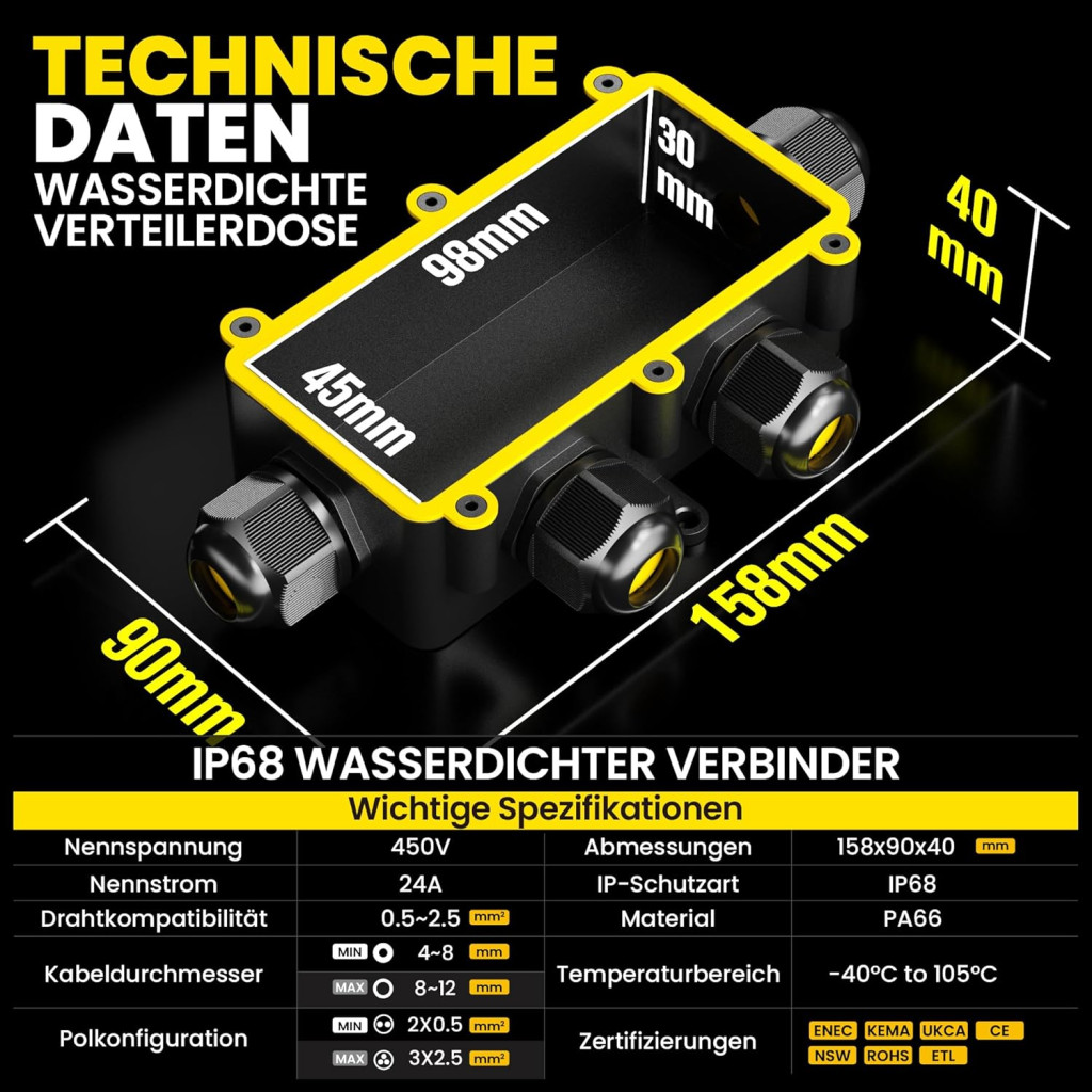 Cutia de joncțiune funcționează cu o secțiune transversală a cablului cuprinsă între 0,5 mm² și 2,5 mm². Dimensiunile externe sunt 158 x 90 x 40 mm, în timp ce dimensiunile interne sunt 98 x 45 x 30 mm. Produsul poate fi montat pe suprafață, iar diametrul de tăiere este de 90 mm. Toate accesoriile de montare necesare sunt incluse în pachet, astfel încât utilizatorul poate instala rapid și ușor cutia de joncțiune.