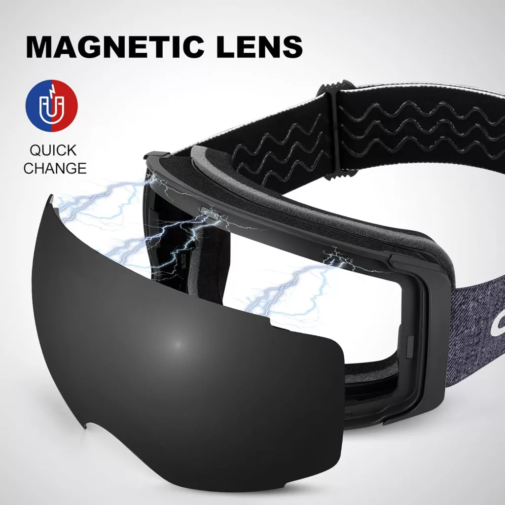 Puteți schimba cu ușurință lentilele fără a avea nevoie de unelte sau montaj complicat. Fixarea magnetică asigură că lentila rămâne în siguranță la locul ei chiar și în timpul schiatului intens.