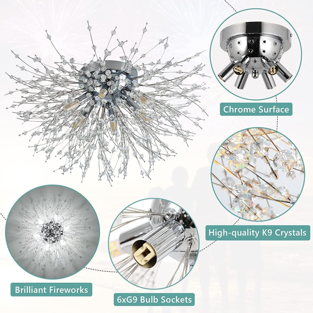 Lampa de tavan modernă cu cristale Rayofly este o adevărată bijuterie pentru casa ta. Acest candelabru special, cu formă de foc de artificii, întruchipează stilul modern, simplu, dar luxos, prin combinația de metal cromat și cristal K9 de înaltă calitate. Când aprindeți lampa, lumina care trece prin cristale creează o atmosferă magică, moale și frumoasă în încăpere. Designul cu 6 becuri oferă o lumină abundentă, în timp ce designul tip foc de artificii oferă un aspect unic și elegant casei tale.
