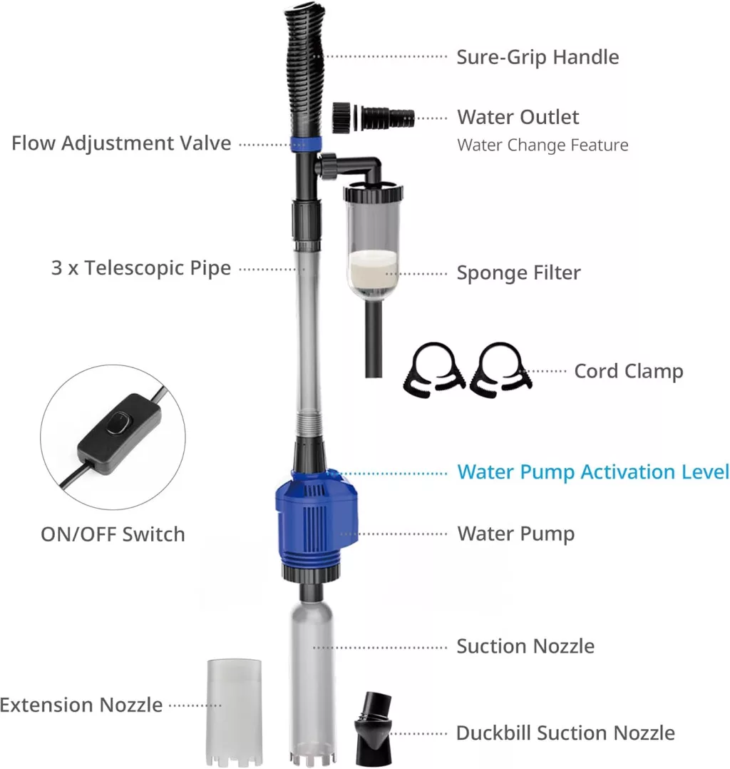 • Különböző aljzattípusok: Hatékonyan tisztítja a kavicsot, homokot és más akváriumi aljzatokat anélkül, hogy felkavarná azokat.
