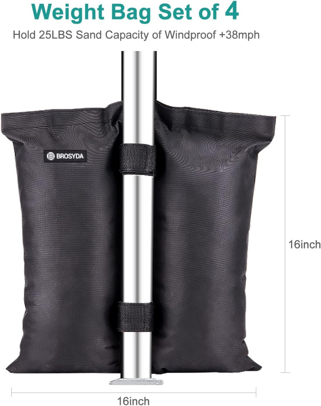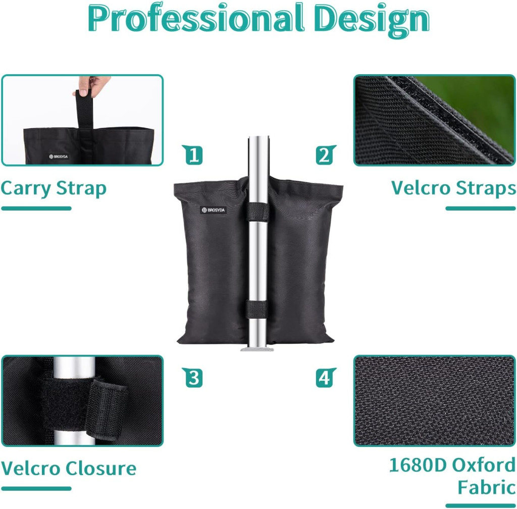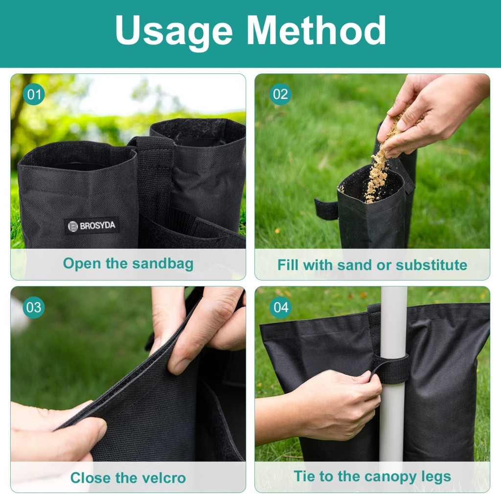 Fiecare sac de nisip are o capacitate de încărcare de 25 livre (aprox. 11 kg), suficient pentru a vă stabiliza cortul și a preveni răsturnarea cauzată de vânt. Setul este format din 4 bucăți, oferind o capacitate totală de ponderare de 100 livre (45 kg). Sistemul universal de fixare cu Velcro se adaptează la diametre ale piciorului cuprinse între 15-80 mm, fiind compatibil cu aproape toate tipurile de corturi.