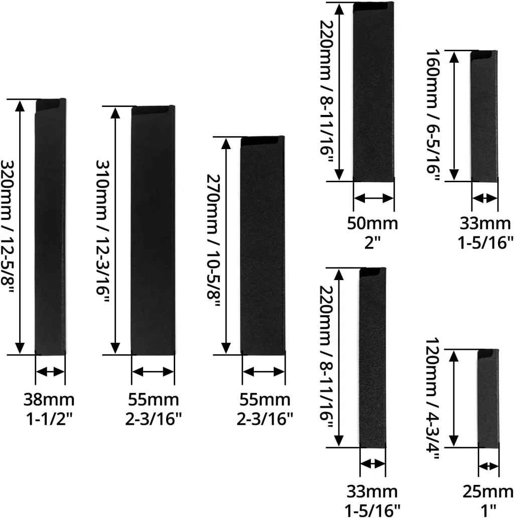 - 7 dimensiuni diferite: 12 cm × 2,5 cm (2 buc.), 16 cm × 3,3 cm (2 buc.), 22 cm × 5 cm (2 buc.), 22 cm × 3,3 cm (1 buc.), 27 cm × 5,5 cm (1 buc.), 32 cm × 3,8 cm (1 buc.), 31 cm × 5,5 cm (1 buc.)