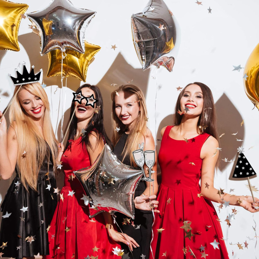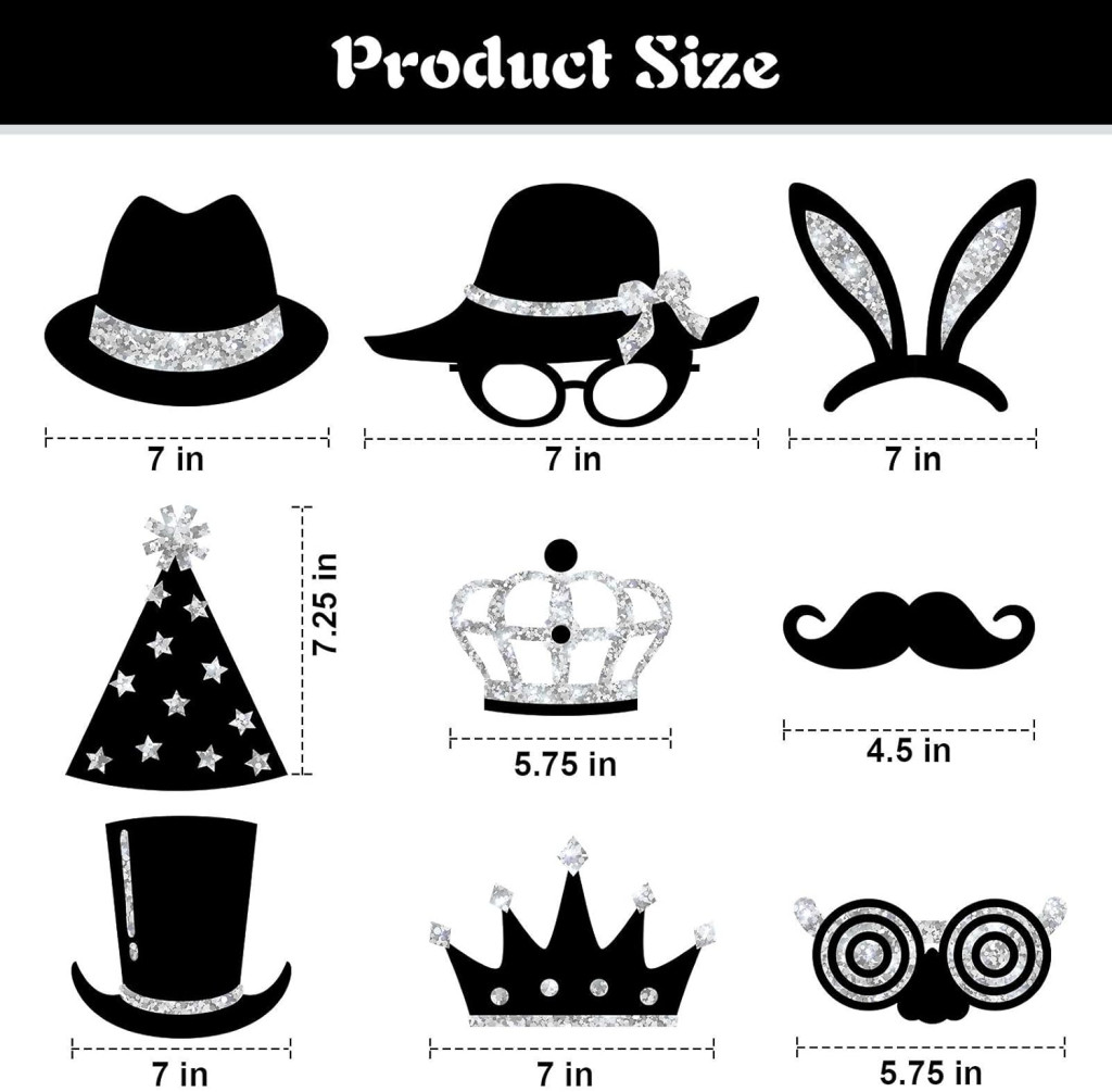 Produsul include diverse elemente distractive, cum ar fi cravate, inimi, pahare de vin, mustăți, torturi, pălării, coroane, buze care trimit săruturi, ochelari și multe alte accesorii interesante. Fiecare accesoriu este atent conceput pentru a arăta bine în fotografii și pentru a se potrivi perfect cu atmosfera petrecerii.