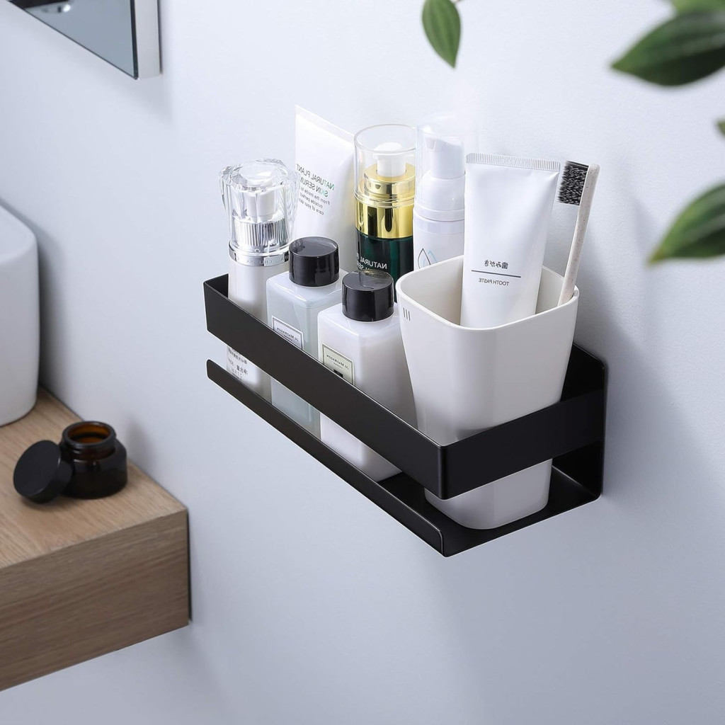 YIGII Raft pentru Baie din Oțel Inoxidabil, Negru, Fără Găurire, Suport pentru Șampon