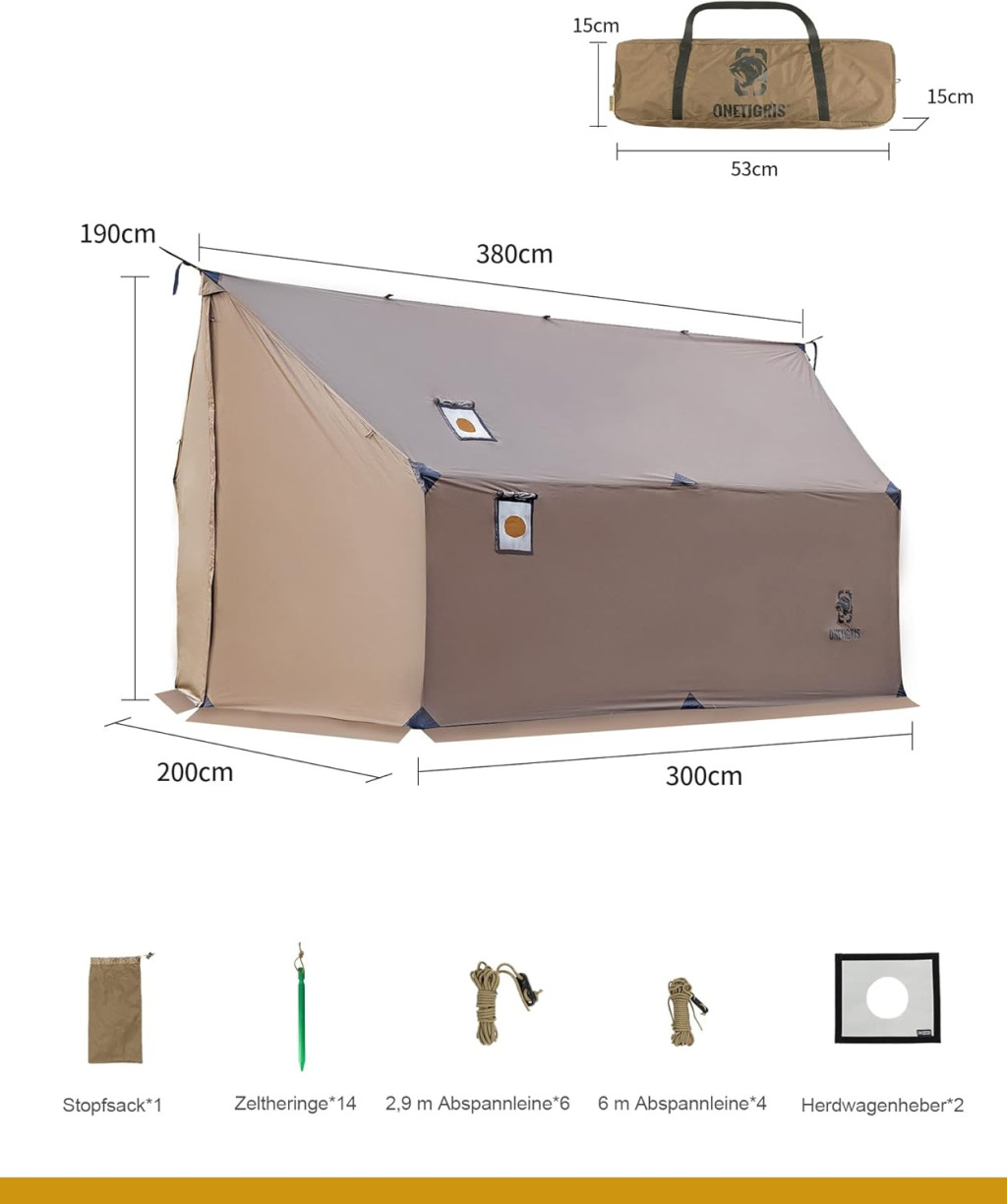 Cortul TEGIMEN, cu dimensiunile sale de 380 cm × 200 cm × 190 cm, oferă suficient spațiu pentru una sau două persoane, precum și pentru echipamentul necesar. Dimensiunea sa compactă pliată (53 cm × 15 cm × 15 cm) și greutatea de doar 3,08 kg îl fac ideal pentru drumeții lungi și expediții. Produsul vine cu un set complet de 14 cuie de cort, 10 corzi de ancorare și 2 adaptoare pentru orificiul sobei.