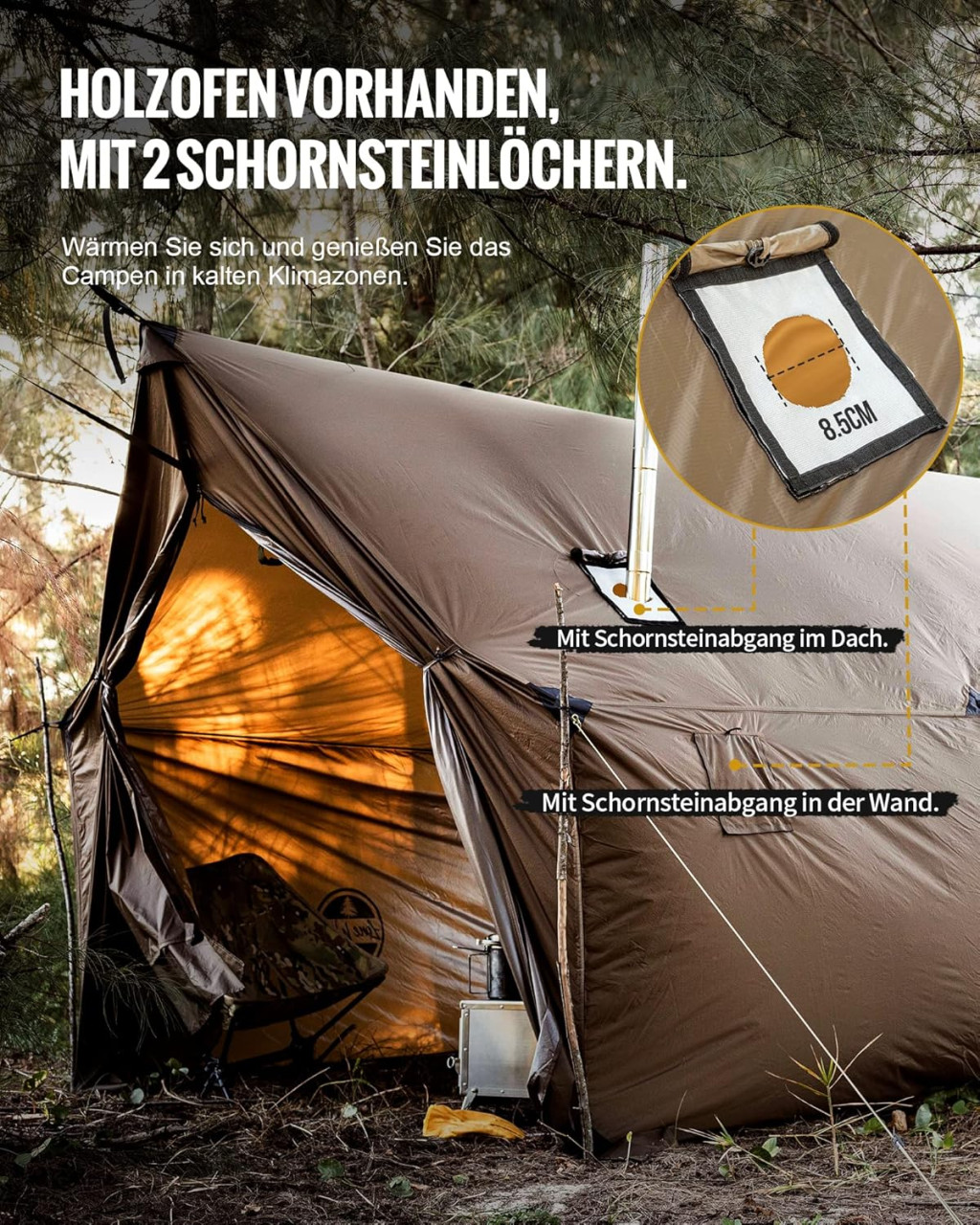 Compatibilitate cu Sobă 1 orificiu pentru sobă pe acoperiș și 1 pe peretele lateral, pentru diferite unghiuri ale coșului de fum. Perfect pentru camping de iarnă cu sobă.