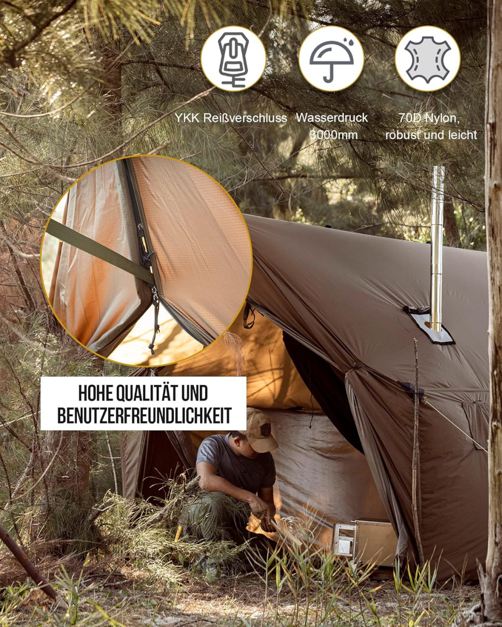 Fermoarele YKK sunt de înaltă calitate și durabile, iar fusta rezistentă la vânt asigură reținerea căldurii. Structura cortului este puternică și stabilă, capabilă să reziste la viteze mari ale vântului și la sarcini grele de zăpadă.