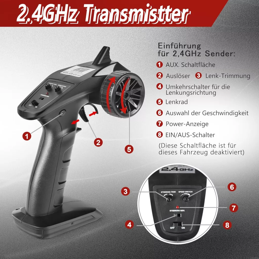 - Telecomandă de 2.4 GHz: Distanță de control de 60-80 de metri, funcționalitate completă