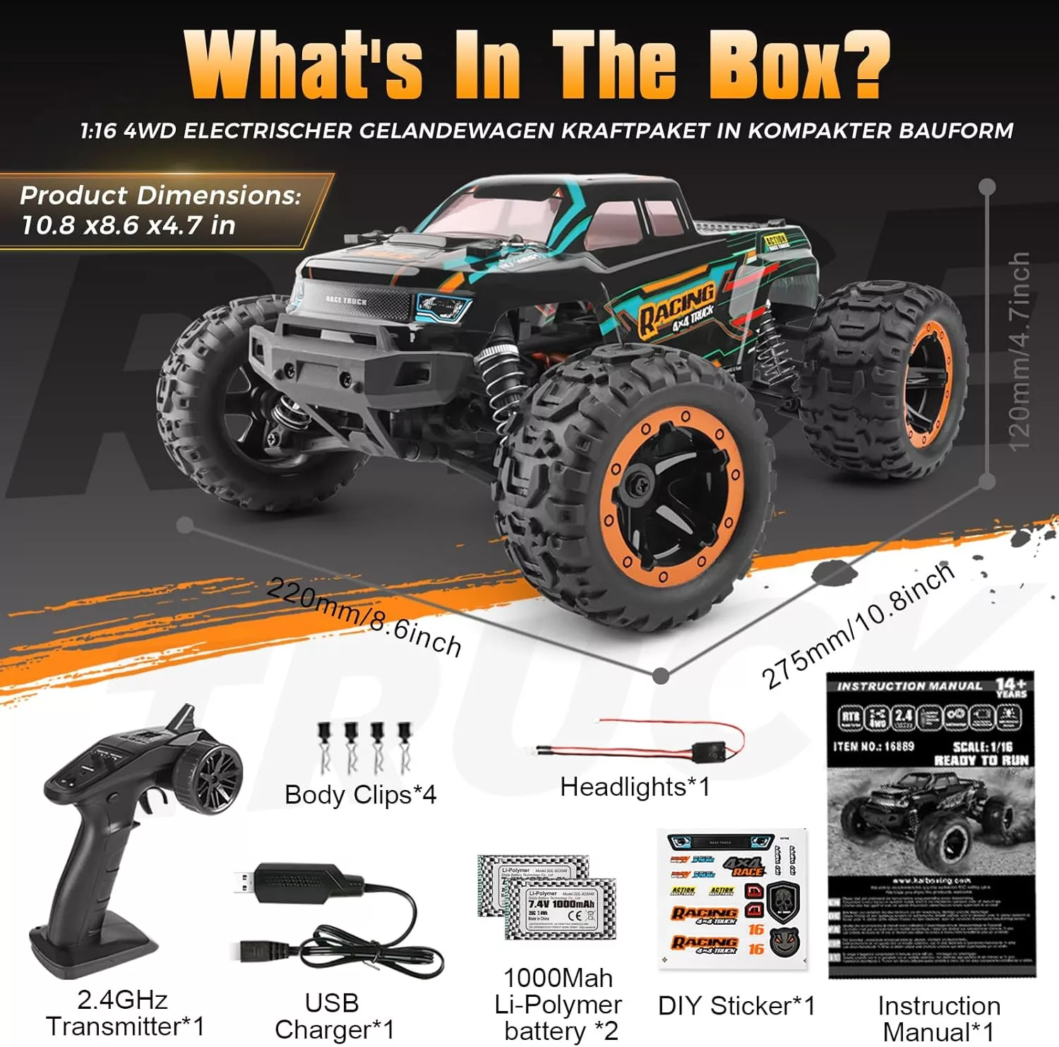 Haiboxing Ravage 16889 este o mașină cu telecomandă de nivel profesional, perfectă atât pentru începători, cât și pentru pasionații RC experimentați. Acest monster truck la scara 1:16 are o viteză maximă de 36 km/h, oferind performanțe impresionante în curse și utilizare recreațională. Mașina este echipată cu rulmenți cu bile complet metalici și un sistem de tracțiune 4WD, care asigură o funcționare lină și fiabilă pe toate terenurile.