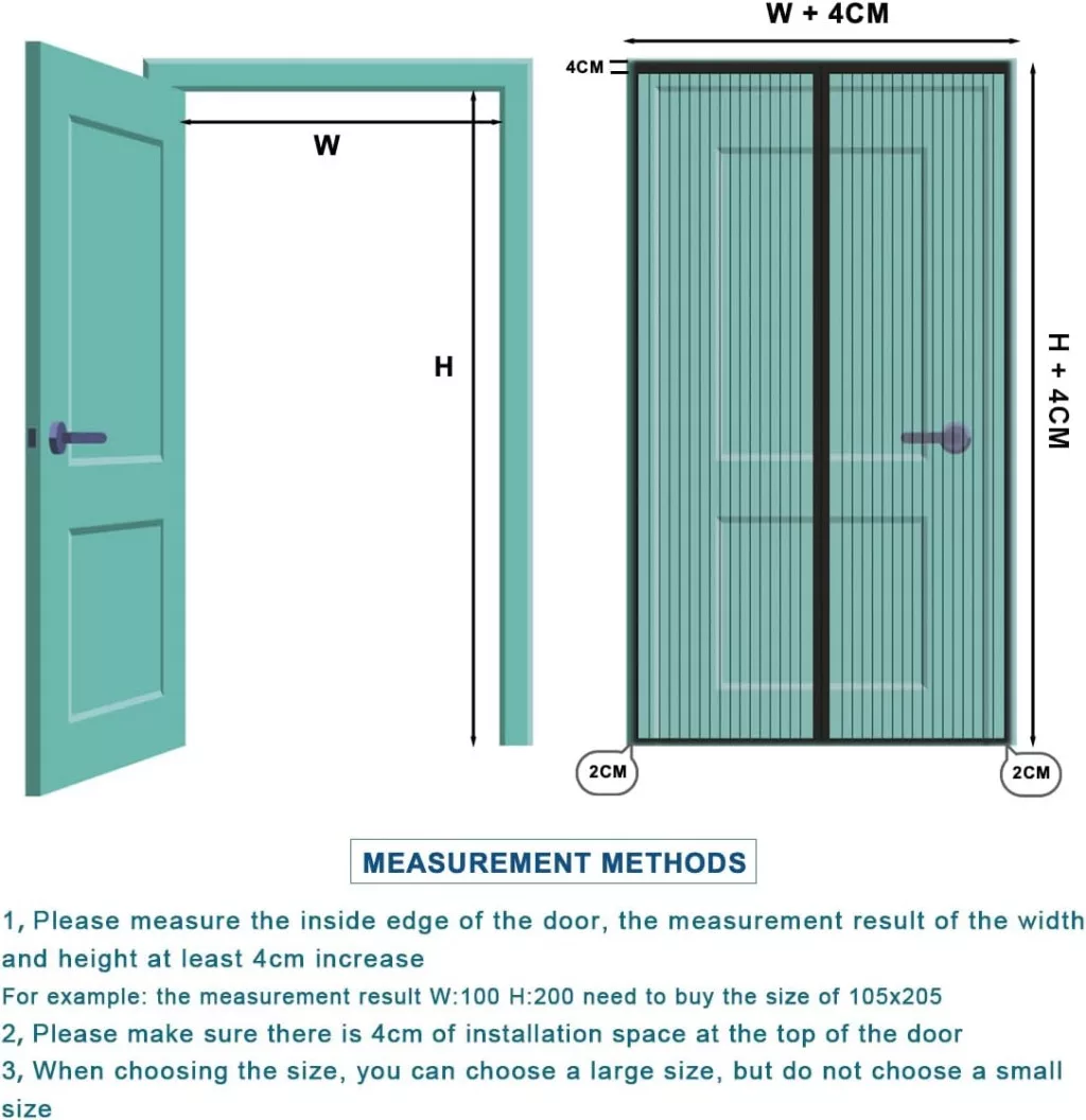 Măsurare: Dimensiunea produsului trebuie stabilită în funcție de cadrul interior al ușii. Măsurați lățimea și înălțimea interioară a tocului ușii, apoi adăugați cel puțin 4 cm în ambele direcții. De exemplu, dacă dimensiunea interioară a ușii este de 96 x 211 cm, dimensiunea de 100 x 215 cm este alegerea ideală.