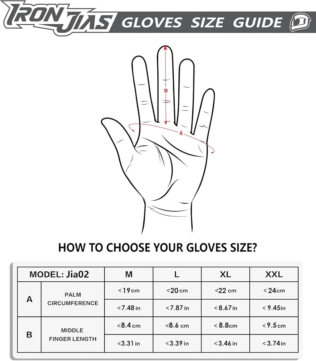 Mănușile IRON JIA'S au un design ambidextru (potrivite pentru ambele mâini), fiind o alegere perfectă pentru orice motociclist. Produsul este disponibil în mărimea L, care se potrivește majorității utilizatorilor adulți. Este important de reținut că mănușile nu respectă standardele de măsurare UE, de aceea recomandăm consultarea tabelului de mărimi înainte de achiziție pentru o potrivire perfectă.