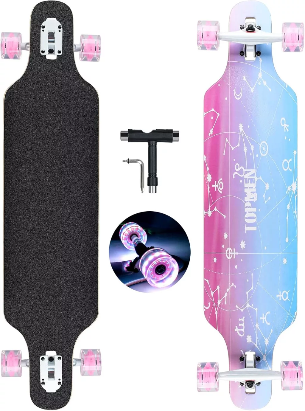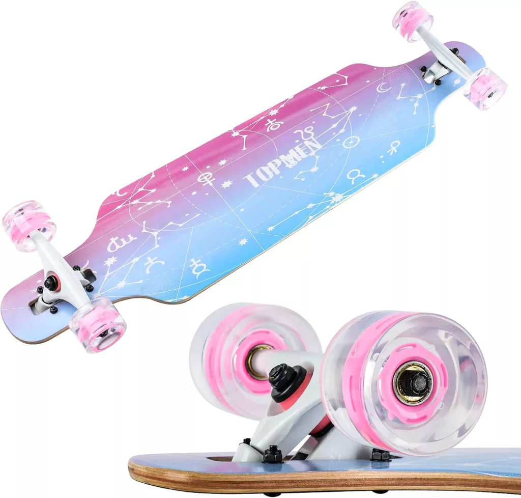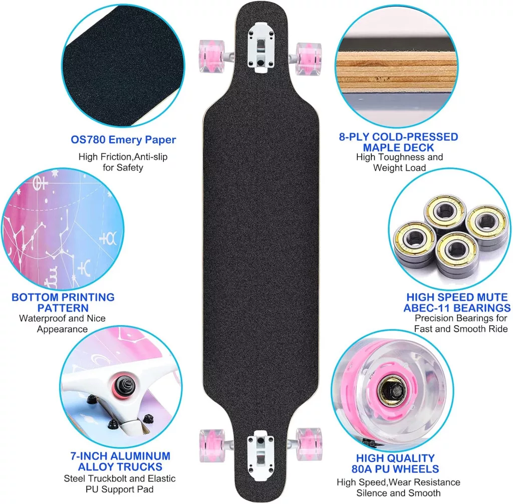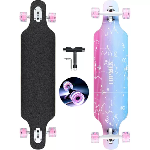 CLYCTIP Longboard Skateboard este o placă cruiser de calitate profesională, perfectă pentru începători, adolescenți, adulți și skateboarderi avansați. Acest set complet de skateboard de 104 cm lungime și 24 cm lățime vine cu toate componentele necesare, inclusiv o unealtă T, astfel încât poate fi utilizat imediat. Placa cu 8 straturi de arțar chinezesc presat la rece oferă stabilitate și durabilitate excepționale, în timp ce rulmenții precisi ABEC-11 și roțile PU 80A garantează o rulare lină și silențioasă.