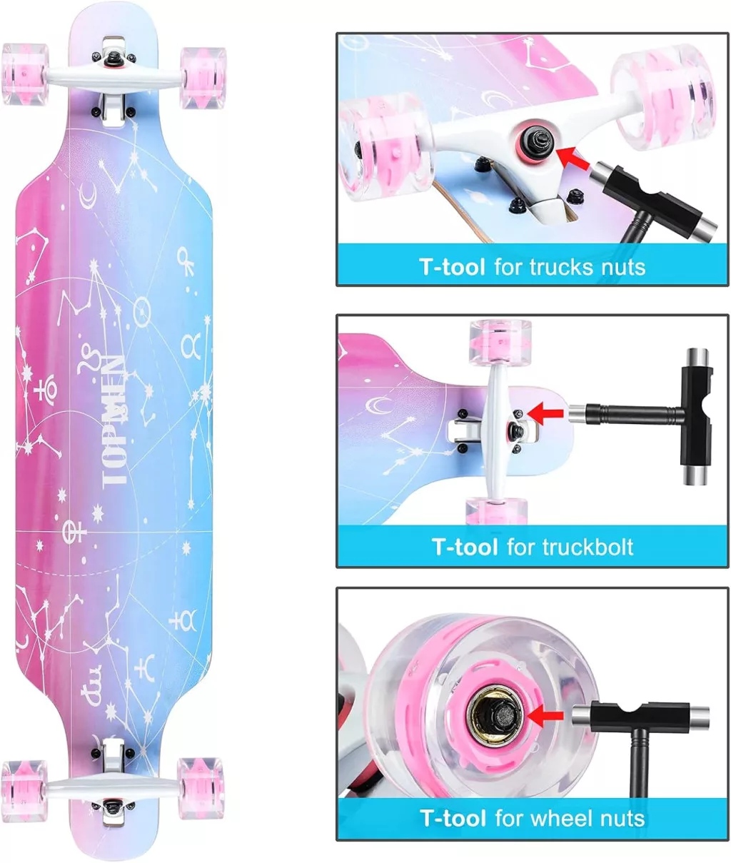 Acest longboard skateboard este un cadou ideal pentru băieți, fete, adolescenți și adulți deopotrivă. Deoarece este un set complet și nu necesită asamblare, poate fi utilizat imediat. Unealta T inclusă permite reglarea și întreținerea, astfel încât cumpărătorul nu trebuie să achiziționeze instrumente suplimentare. Este alegerea perfectă pentru cei care iubesc activitățile în aer liber, mișcarea și aventura. Dezvoltă echilibrul, forța și reflexele, oferind în același timp un hobby distractiv și sănătos.
