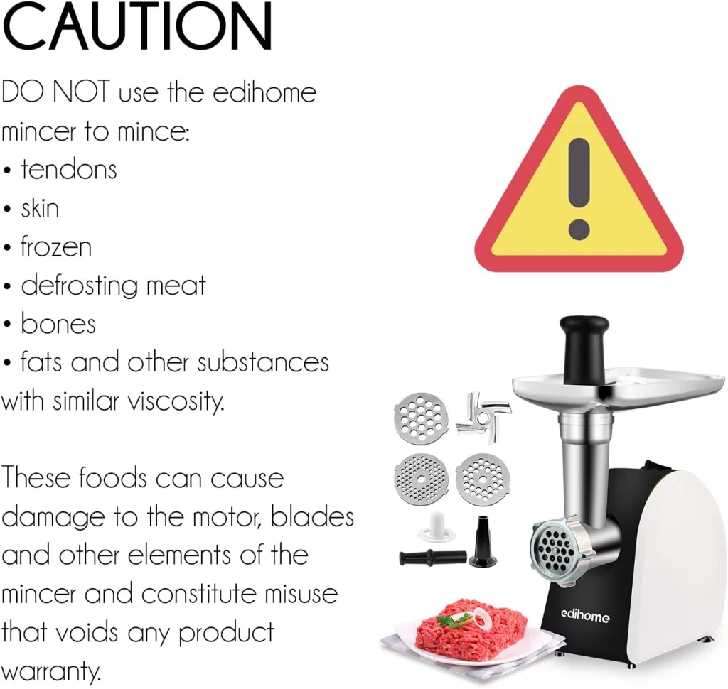 Tisztítás: Az Edihome húsdaráló nem mosogatógépben tisztítható. Az alumínium alkatrészeket meleg vízzel és kézzel kell tisztítani. Ne használj lúgos vagy fehérítő szereket, mivel ezek károsíthatják az anyagot.
