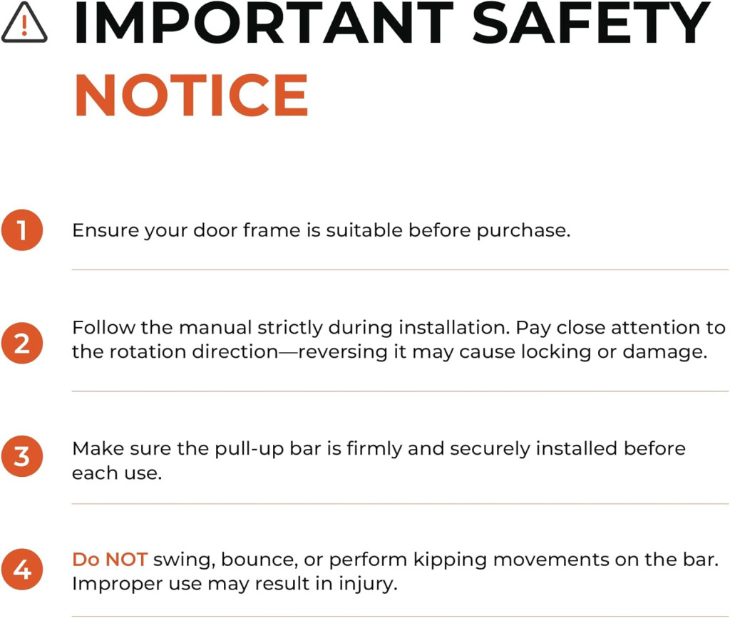 Selectarea tocului de ușă potrivit este crucială pentru o utilizare sigură. Evită plăcile ceramice, sticla sau tocurile de ușă instabile. Bara de tracțiuni este potrivită numai pentru tocuri de ușă solide, capabile să suporte greutate.