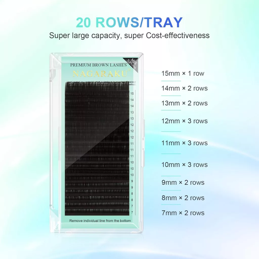 Colecția de gene false maro închis NAGARAKU este alegerea numărul unu a stiliștilor de gene profesioniști și a celor care lucrează în industria frumuseții. Acest set de gene premium, cu grosimea de 0,07 mm și curbura D, creează un echilibru perfect între aspectul natural și efectul dramatic. Firele cu lungimi mixte de 7-15 mm permit extensii de gene personalizate, astfel încât să puteți obține un rezultat final care se potrivește perfect cu orice formă a feței și a ochilor.
