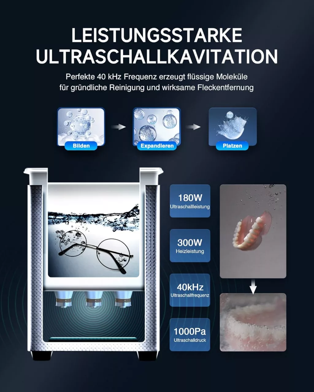 - Putere de 180 W: Unde ultrasonice puternice pentru o curățare eficientă și rapidă