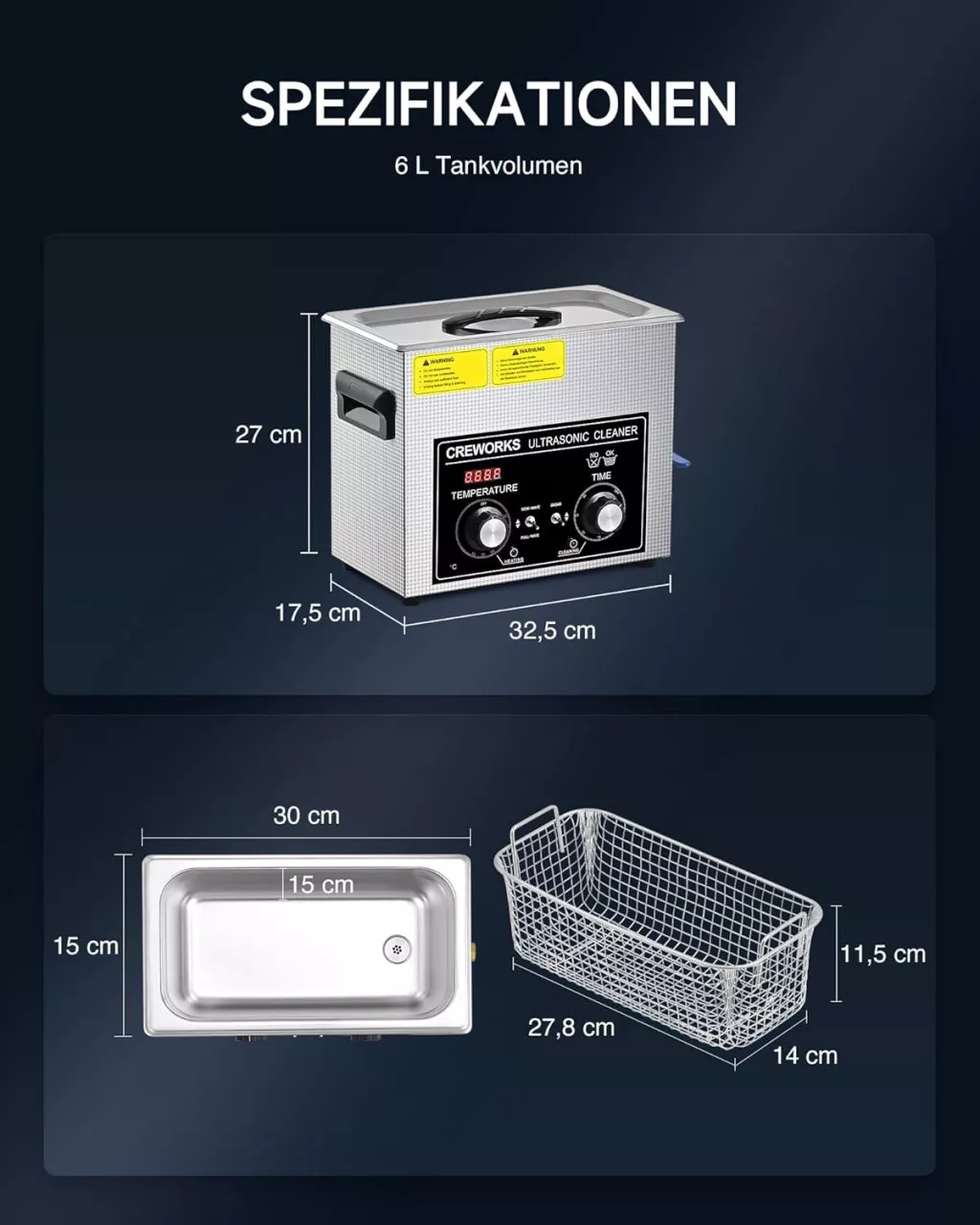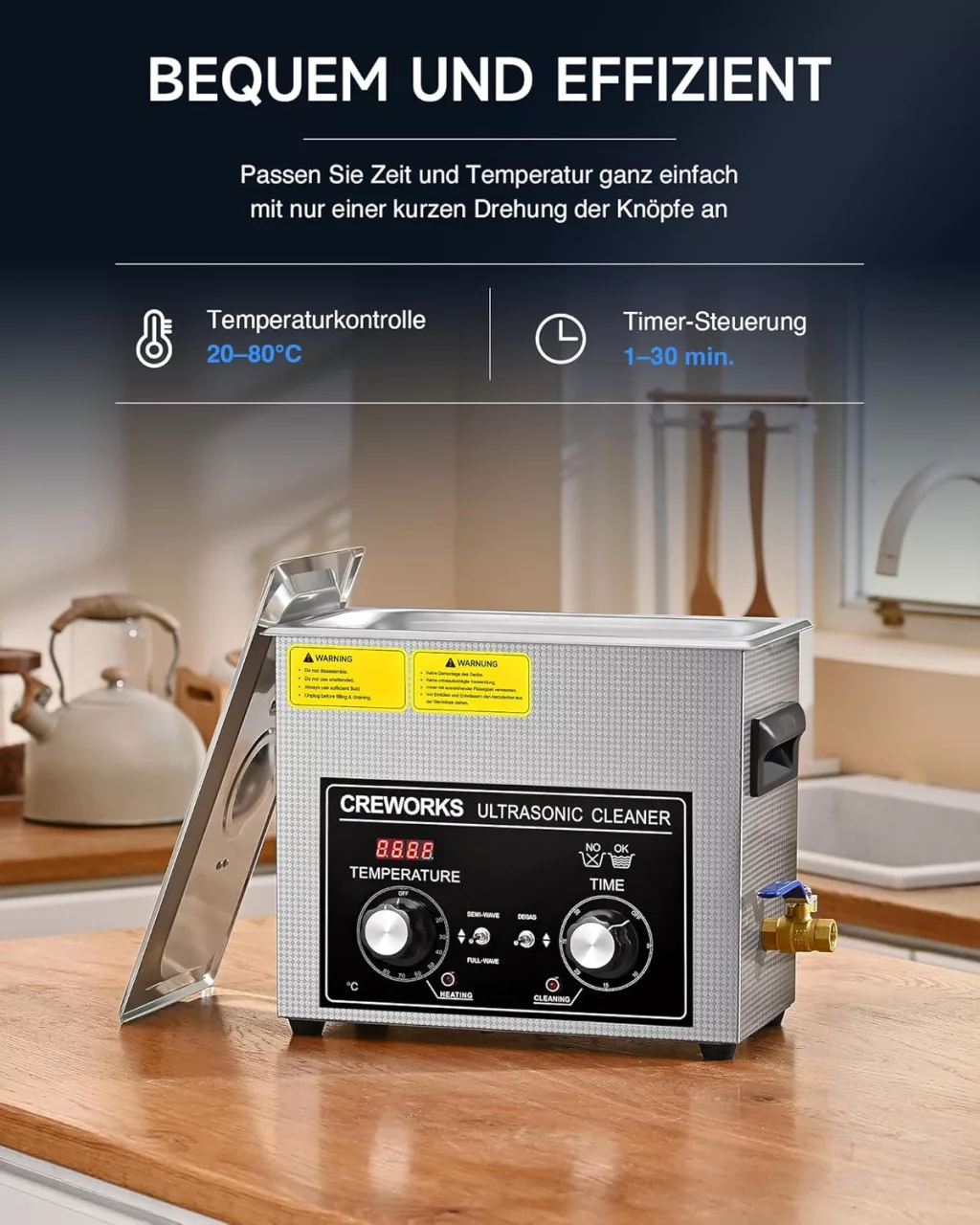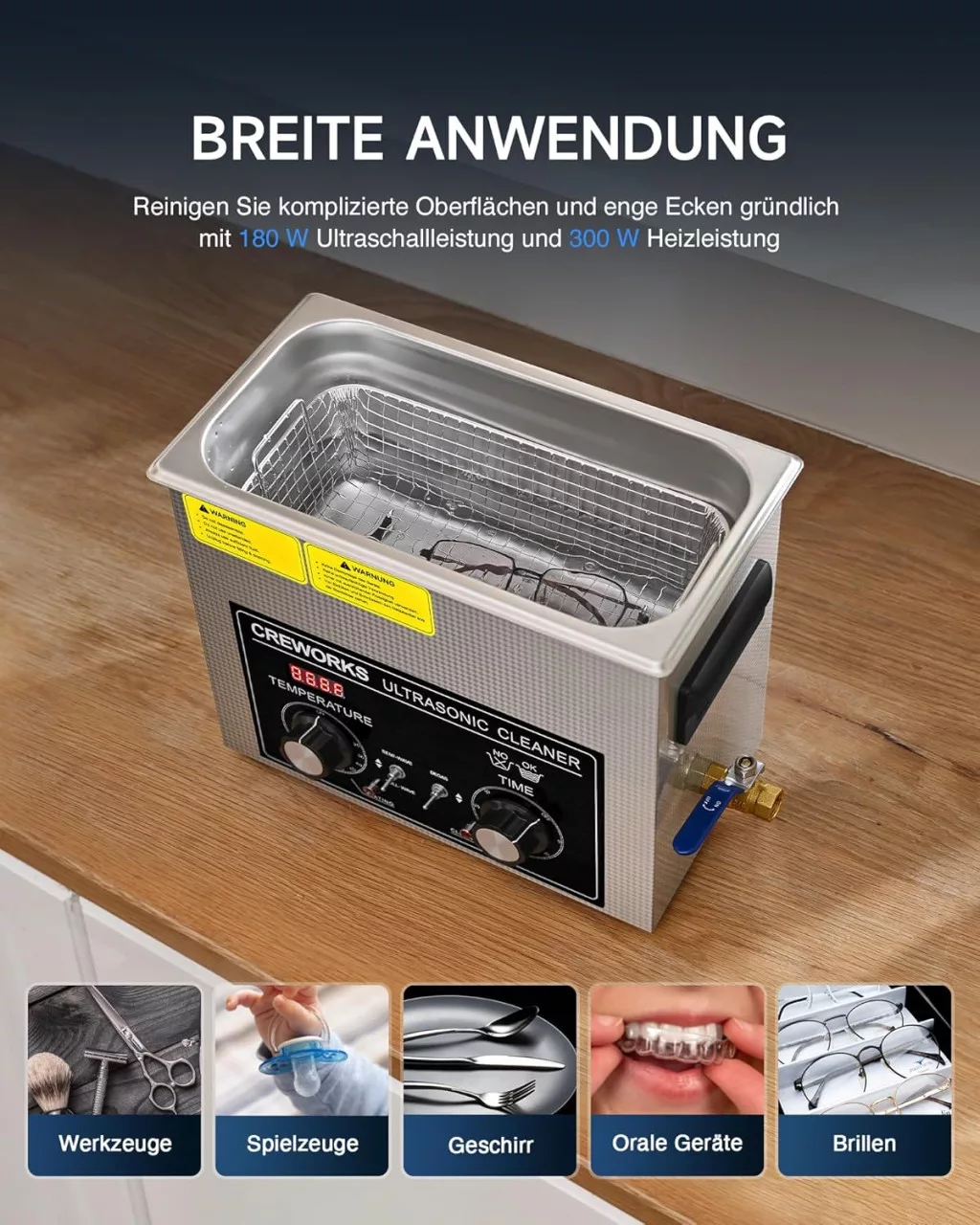 Indiferent dacă aveți nevoie de el pentru uz casnic, laborator școlar sau servicii de curățare profesionale, aparatul de curățare cu ultrasunete CREWORKS este alegerea excelentă. Pe lângă dimensiunea sa compactă și transportabilitatea ușoară, opțiunile de utilizare versatile și operarea intuitivă fac acest instrument indispensabil.