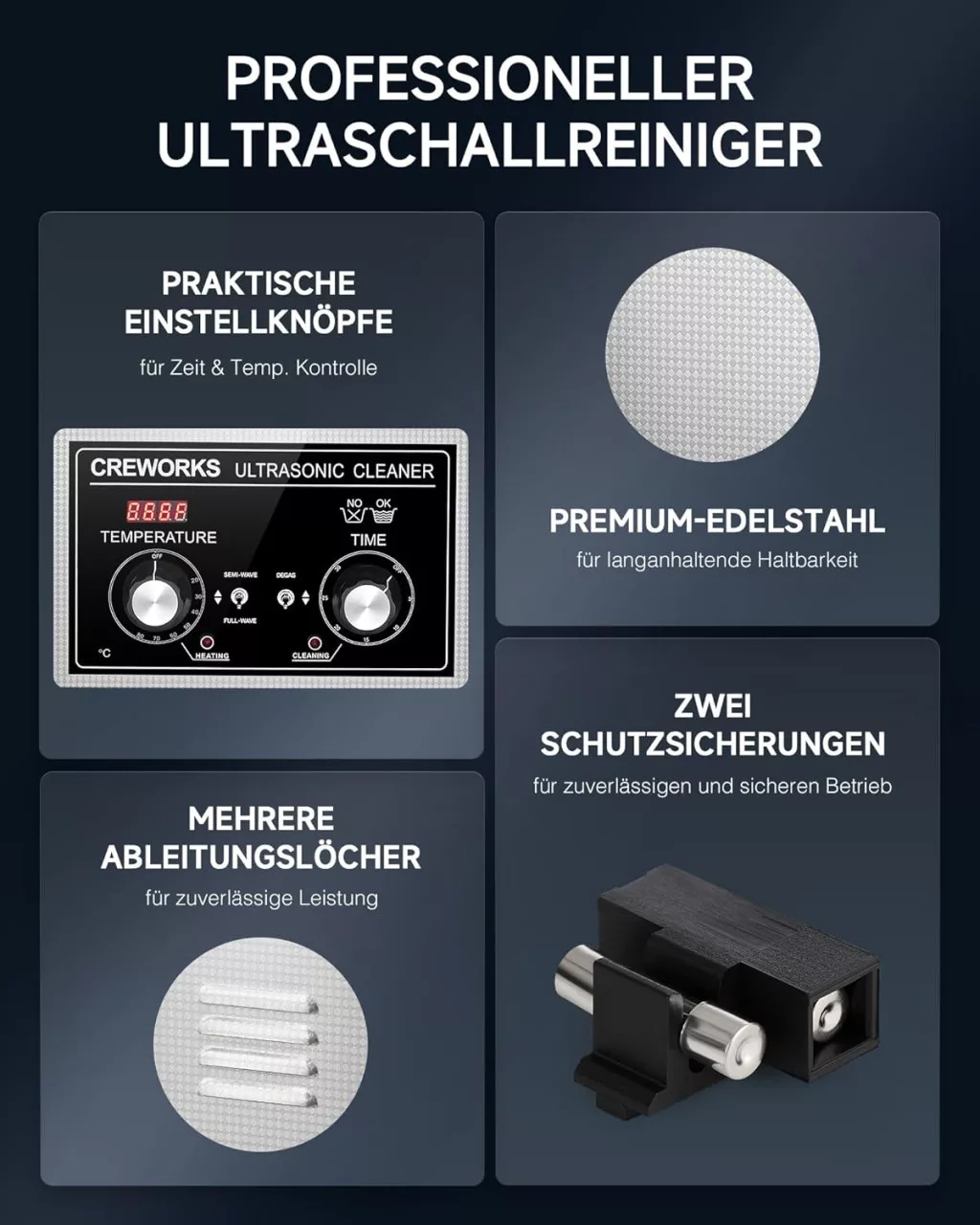 Aparatul de curățare cu ultrasunete CREWORKS este combinația perfectă între calitate profesională și accesibilitate. Puterea de 180 W, funcția de încălzire și numeroasele moduri de curățare asigură că aproape orice obiect poate fi curățat temeinic și în siguranță. Structura din oțel inoxidabil și ingineria atentă garantează că acest dispozitiv va oferi servicii fiabile ani de zile.