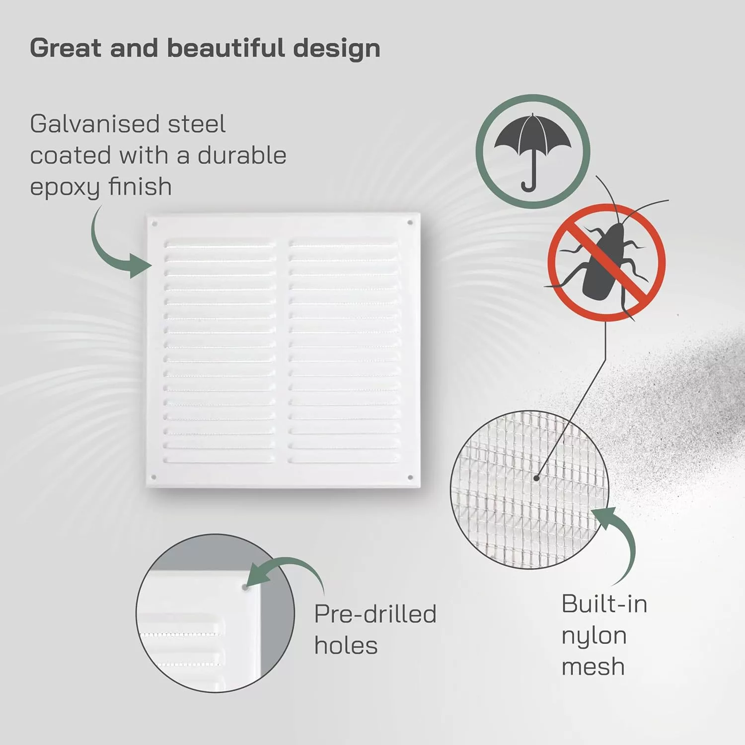 Grila de ventilație Vent Systems este una dintre cele mai bune alegeri de pe piață dacă sunteți în căutarea unei soluții de ventilație de calitate profesională. Materialul din oțel galvanizat garantează o durată lungă de viață și o performanță fiabilă. Plasa anti-insecte integrată oferă protecție, împiedicând pătrunderea insectelor și a impurităților în canalele de ventilație.