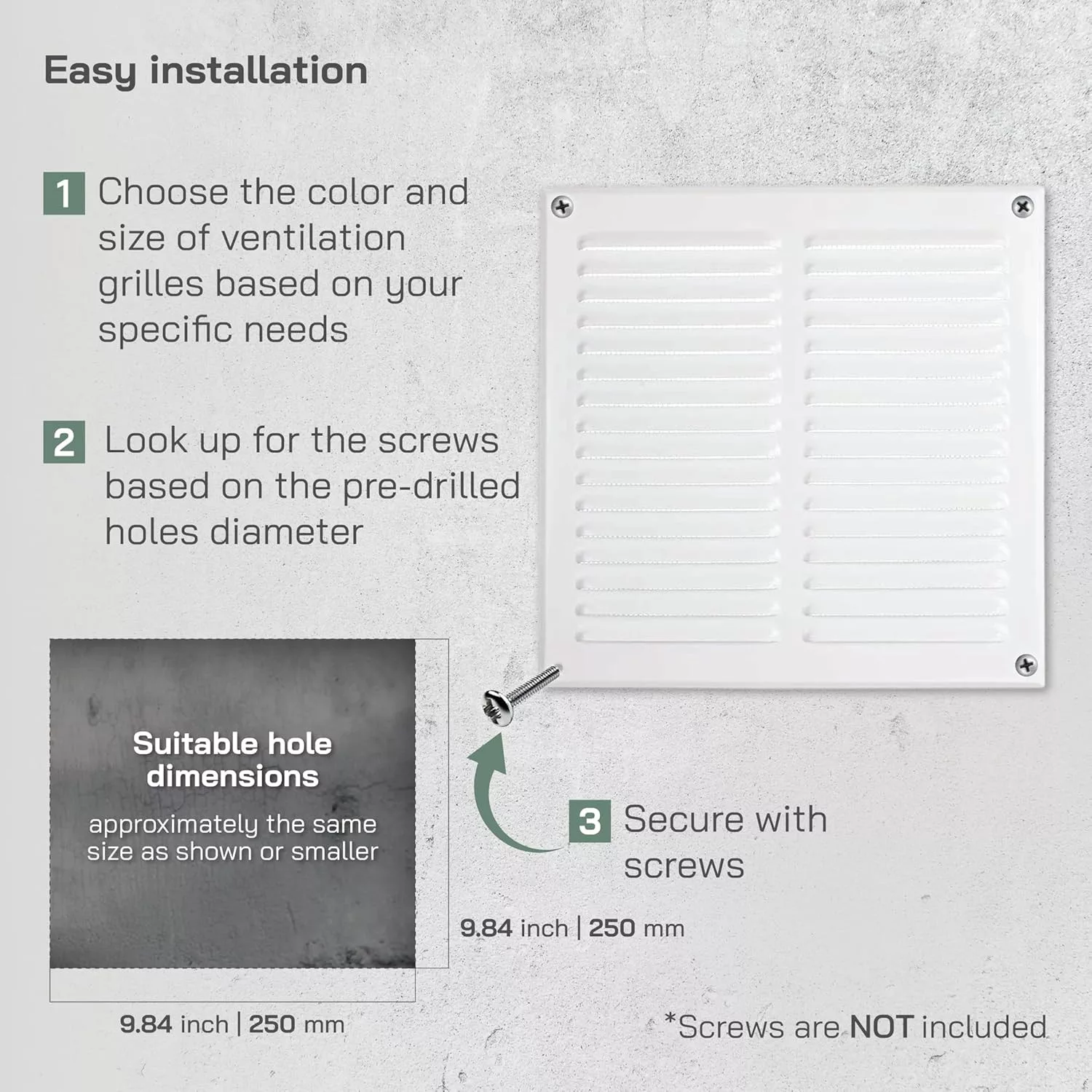 La instalarea grilei de ventilație, asigurați-vă că dimensiunea deschiderii este exact de 24,5 x 24,5 cm. Utilizați șuruburi sau elemente de fixare adecvate pentru o montare sigură. Curățarea periodică a plasei anti-insecte asigură o performanță optimă a ventilației.
