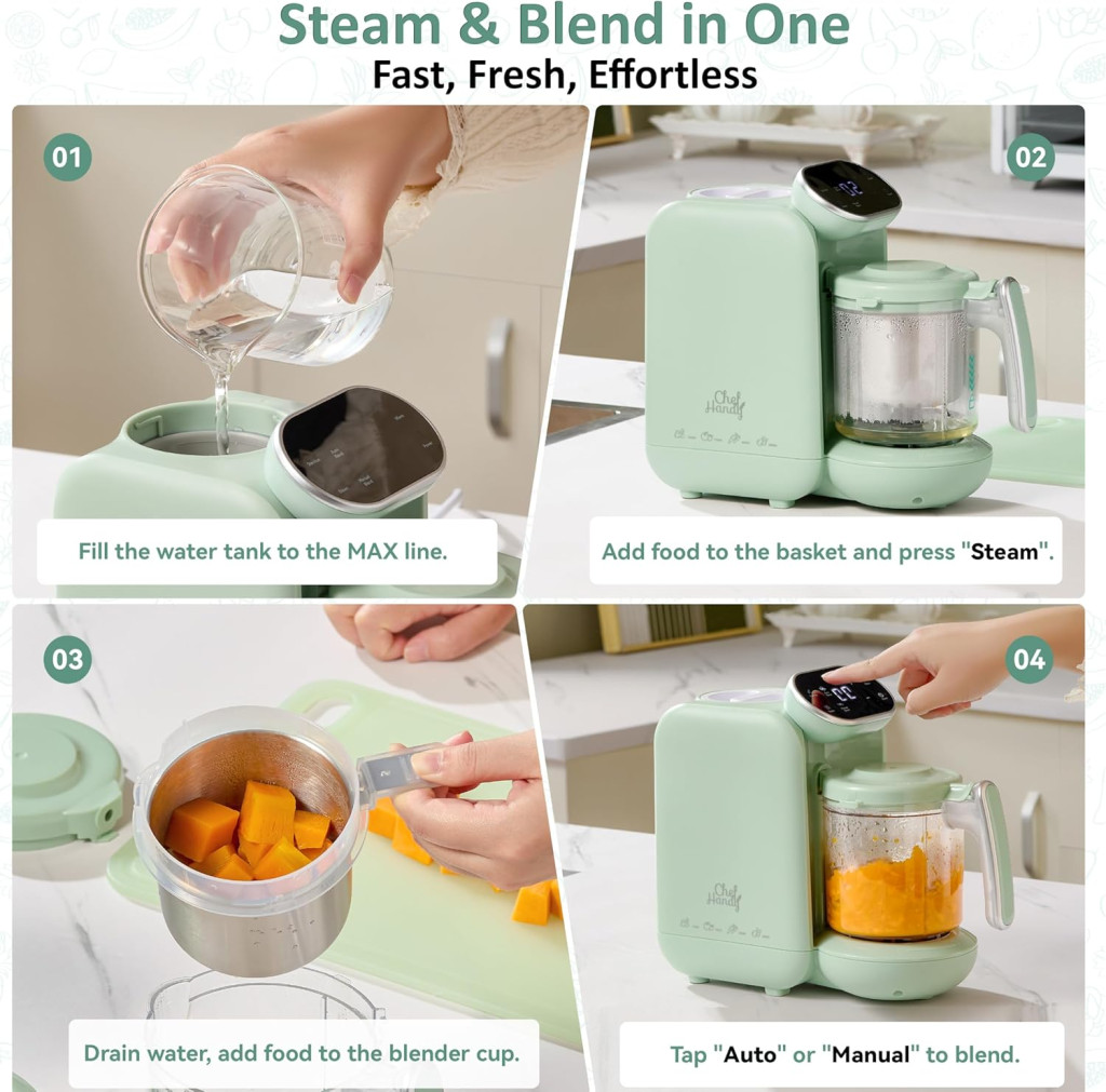 A CHEFHANDY 5-in-1 Baby Food Processor egy revolucionáris megoldás a szülők számára, akik gyors, biztonságos és tápanyagban gazdag bébiételeket szeretnének készíteni. Ez az all-in-one készülék egyesíti az öt legfontosabb funkciót: gőzölést, keverést, melegítést, újramelegítést és palackmelegítést egyetlen elegáns, zöld eszközben.