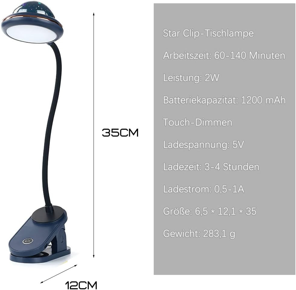 Transformă camera copilului într-un cer înstelat de basm cu lampa de veghe cu clips ACMHNC pentru copii! Această lampă de citit specială, de culoare albastră, nu este doar o sursă de lumină practică, ci și un proiector magic de stele. Designul modern, prietenos pentru copii și gâtul flexibil la 360° permit direcționarea luminii exact acolo unde este nevoie, în timp ce proiecția cerului înstelat creează o atmosferă specială în cameră.