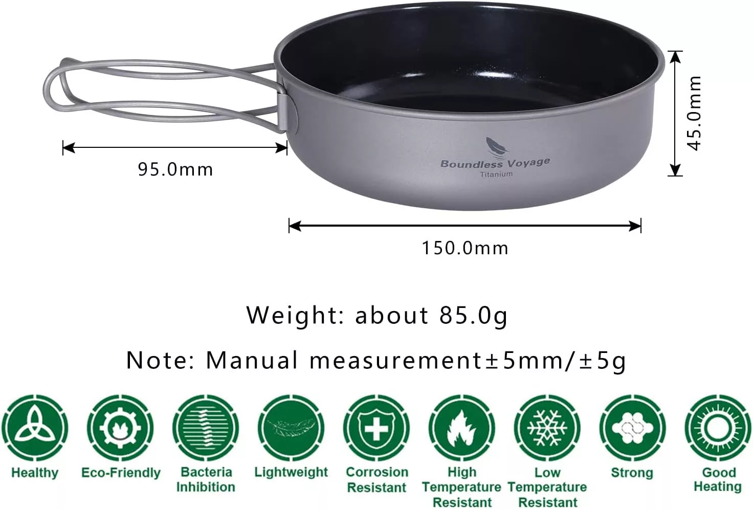 Fie că plecați într-o drumeție lungă, fie că vă pregătiți pentru un weekend de camping, această tigaie din titan vă asigură că vă puteți bucura de mâncăruri gustoase și sănătoase în natură, fără a căra greutate inutilă cu dumneavoastră. Alegeți calitatea Boundless Voyage și duceți-vă experiențele culinare în aer liber la un nou nivel!