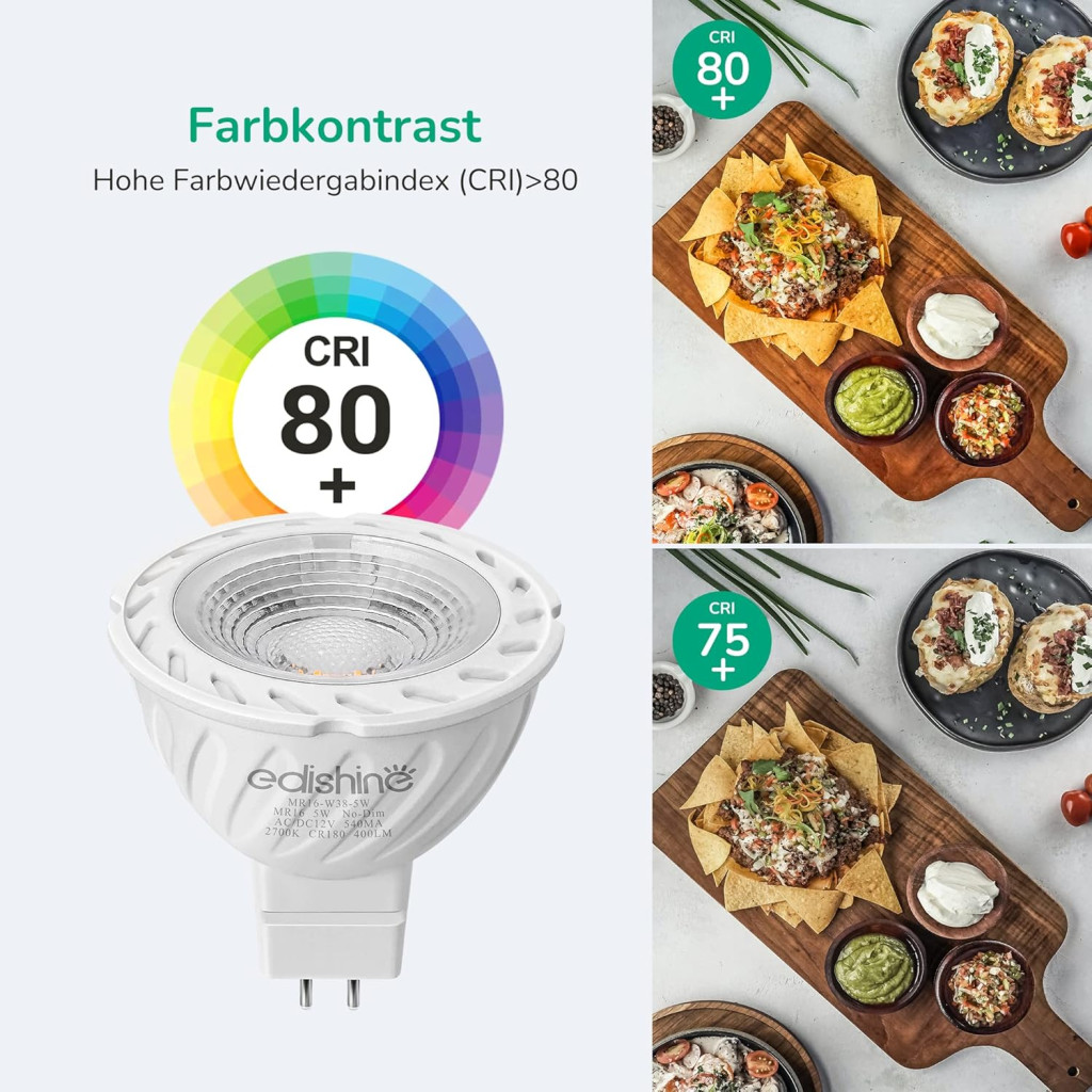 EDISHINE Spot LED GU5.3, 12V MR16, 5W (echivalent 50W), 2700K Alb Cald, 400 Lumeni, Unghi de dispersie 38°, Economie de energie, Pachet de 6 bucăți
